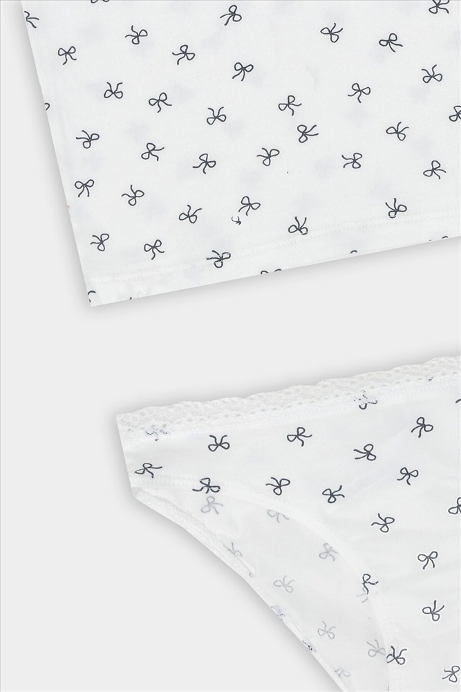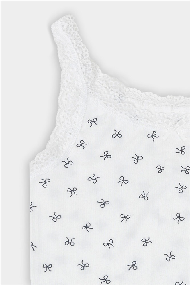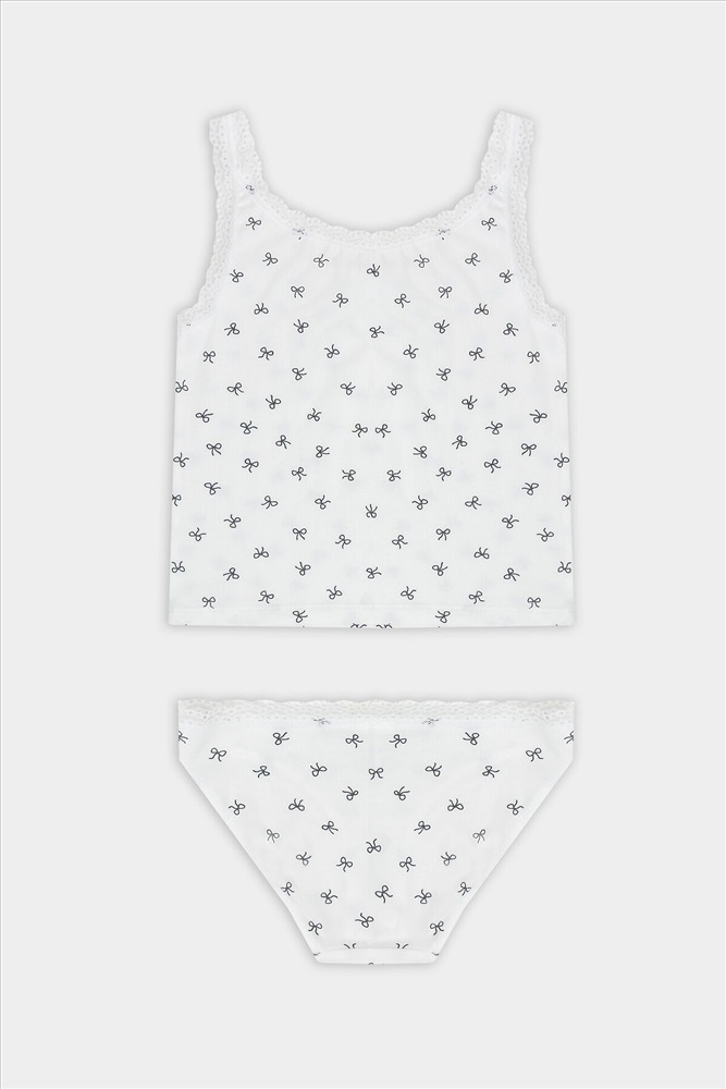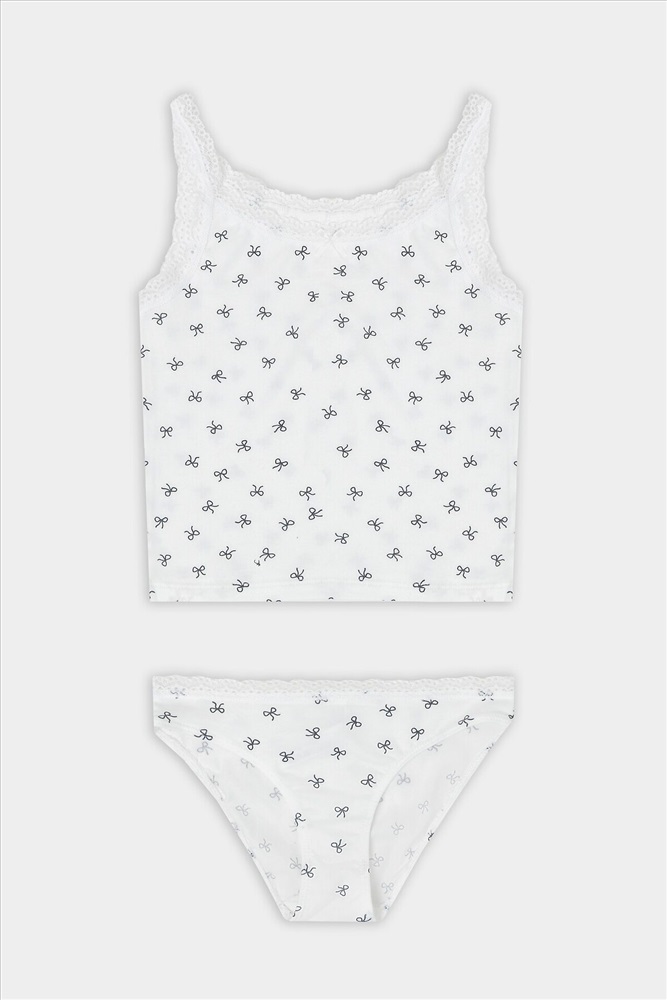 Верхний край трусиков украшен таким же нежным кружевом, что и майка, а бантик завершает гармоничный дизайн.