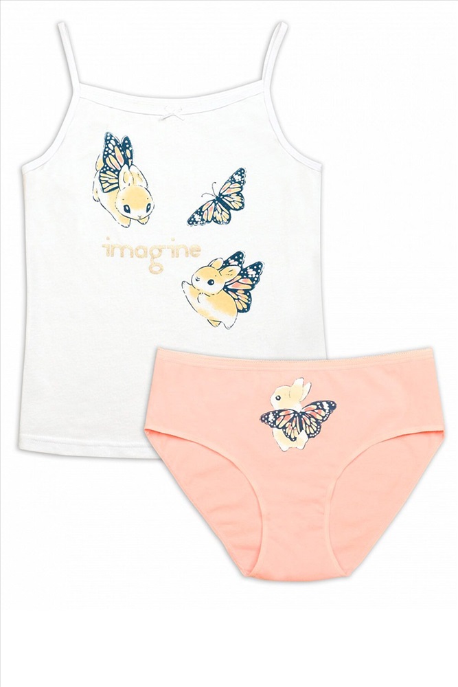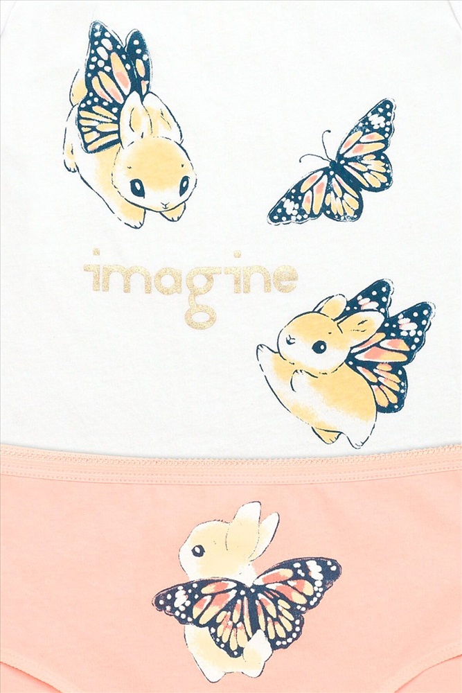 ID товара: 747866 Состав: 100% Хлопок Сезон: Весна/Лето Рисунок: бабочки Декоративные элементы: Печатный принт Основная ткань: Хлопок Модель трусов: Слипы Страна бренда: Россия Страна производства: Китай Комплект для девочек майка и трусики. Майка на тонких бретелях, отделка горловины, пройм и сами бретели из пайпинга. Декор атласным бантиком. Прочный принт, надпись с золотом. Перевод Воображай. Трусики слипы. По талии эластик с фестонным краем, обработка эластиком по ноге. Прочный принт. Комментарии к товару