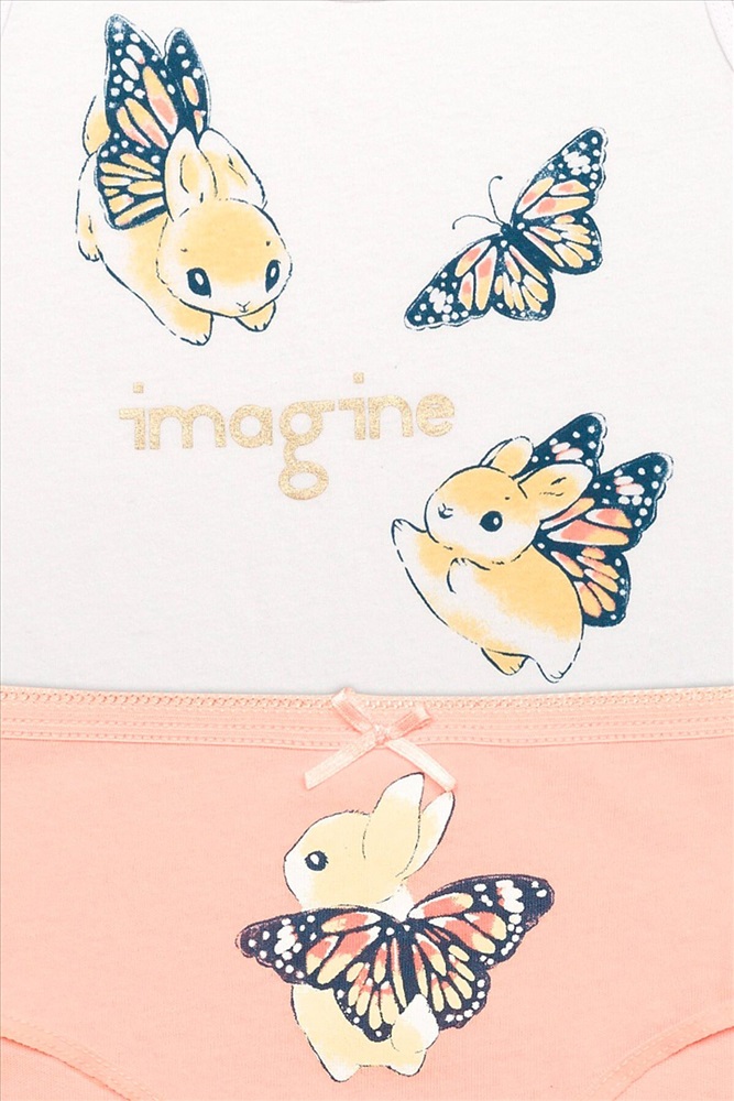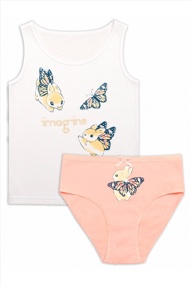 Комплект для девочек майка и трусики. Майка на широких лямках, отделка горловины и пройм пайпингом. Прочный принт, надпись с золотом. Перевод Воображай. Трусики слипы. По талии эластик с фестонным краем, декорирован атласным бантиком, обработка эластиком по ноге. Прочный принт.