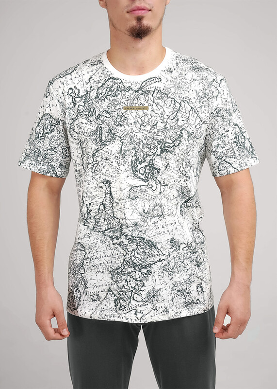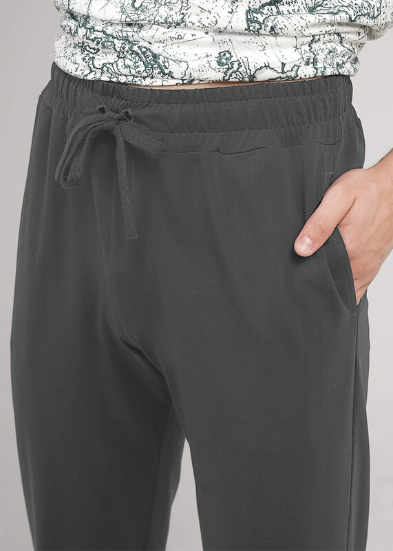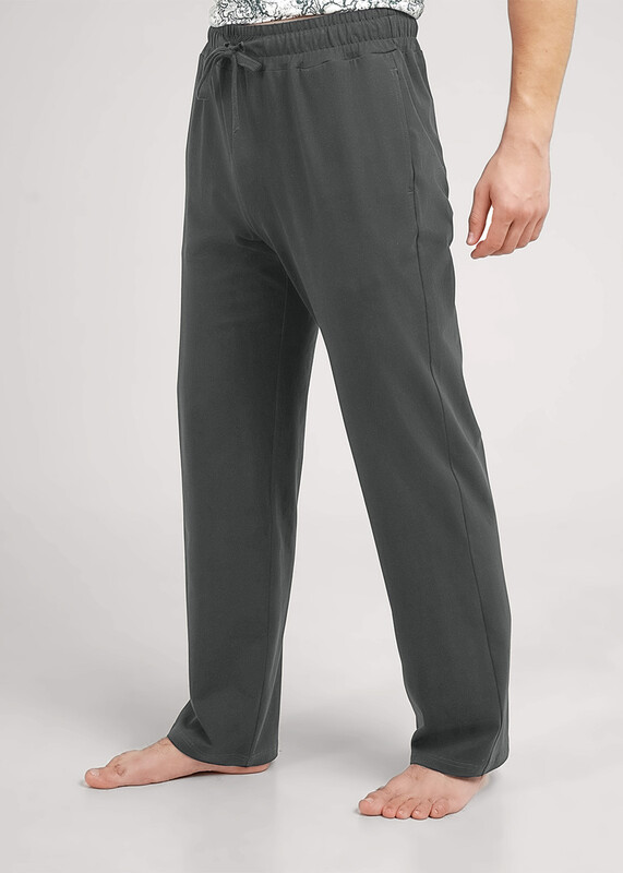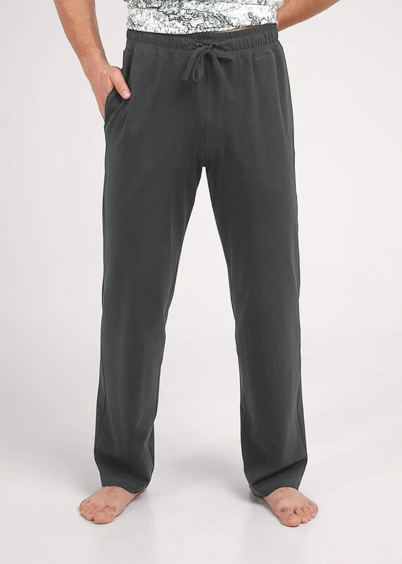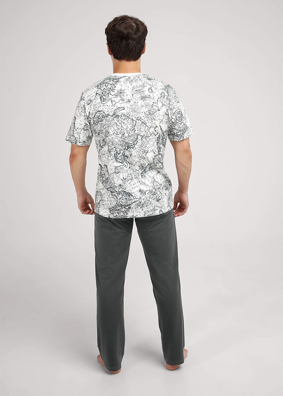 Комплект мужской состоящий из футболки и брюк. Футболка из трикотажного полотна в набивку с коротким рукавом и дизайнерской нашивкой. Брюки из трикотажного полотна на широком поясе с резинкой и регулируемым шнуром, по бокам удобные карманы.