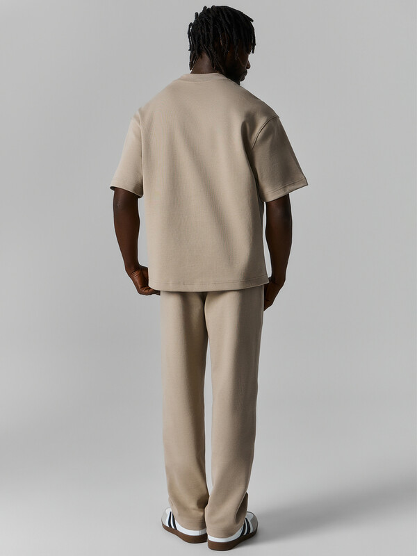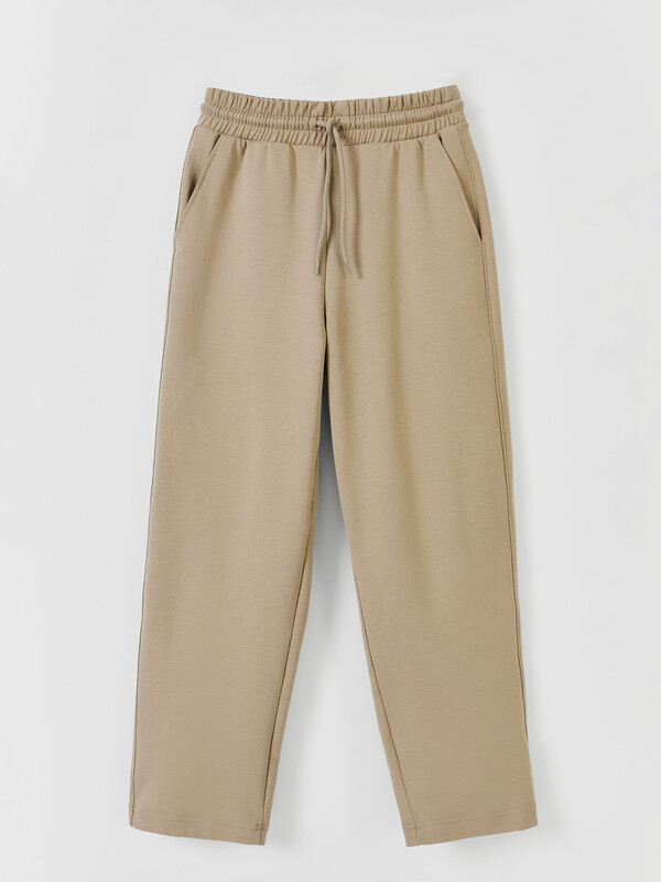 Пояс отрезной с эластичной тесьмой внутри. По переду пробиты петли и втянут шнур 8 мм с эглетами (8EKXWC-1).На деталях переда карманы с отрезным бочком. Подкладка карманов из кулирки. Боковые швы отстрочены декоративной строчкой. Нижние срезы брюк обработаны швом вподгибку.