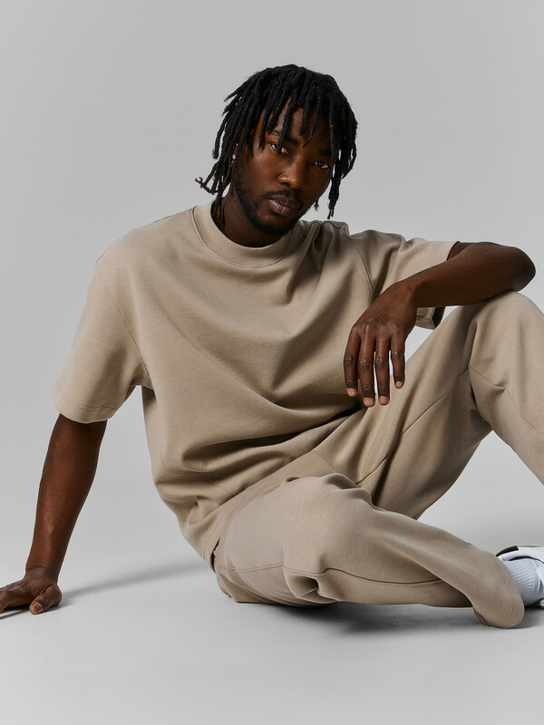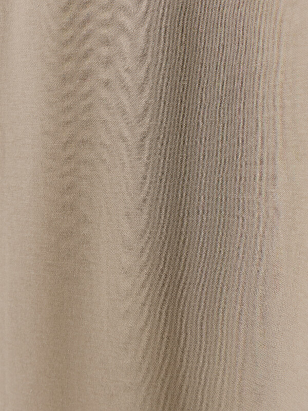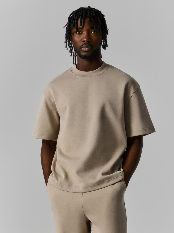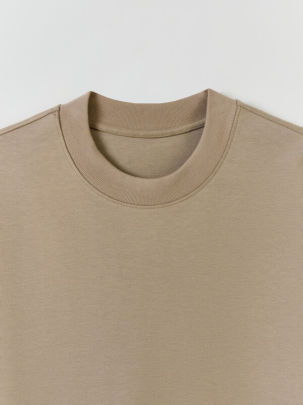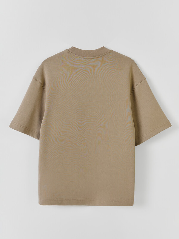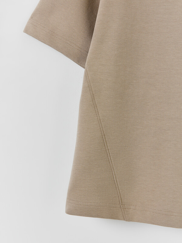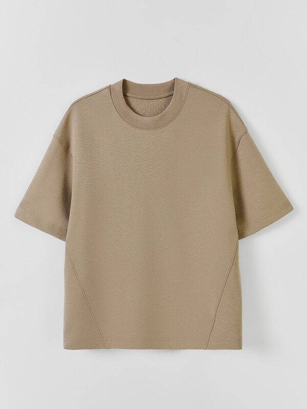 Джемпер прямого силуэта, оверсайз. Боковые швы смещены на деталь переда.Рукав короткий. Линия плеча спущена.Плечевые швы отстрочены декоративной строчкой. Горловина круглой формы. Обработана обтачкой из рибаны. Горловина и окат рукава отстрочены декоративной строчкой Шов втачивания обтачки по спинке закрыт бейкой из кулирки. Нижний срез футболки и рукавов обработан швом вподгибку