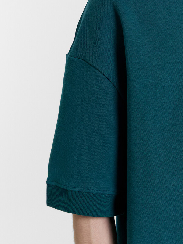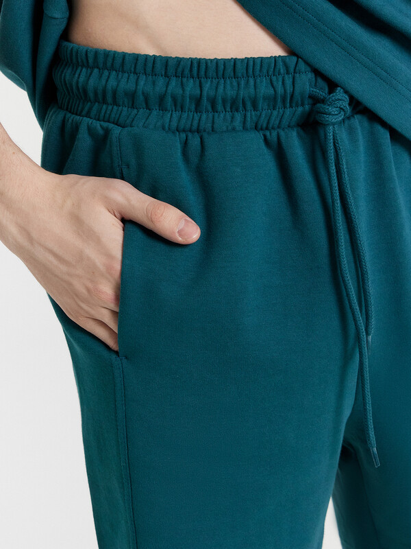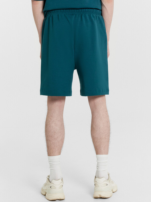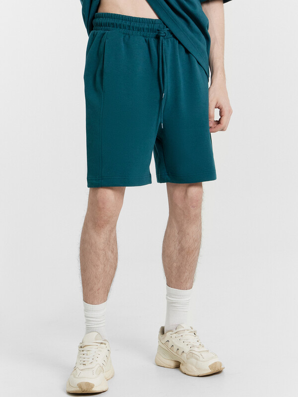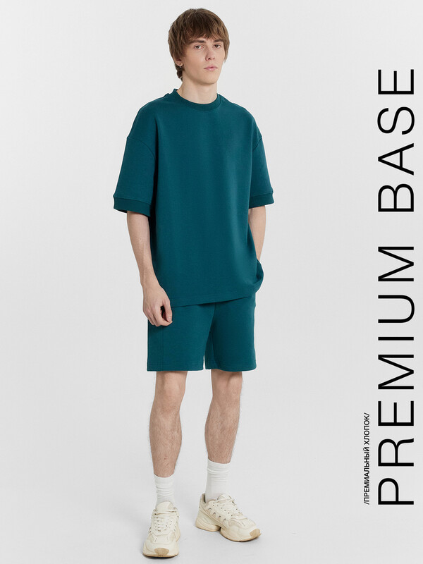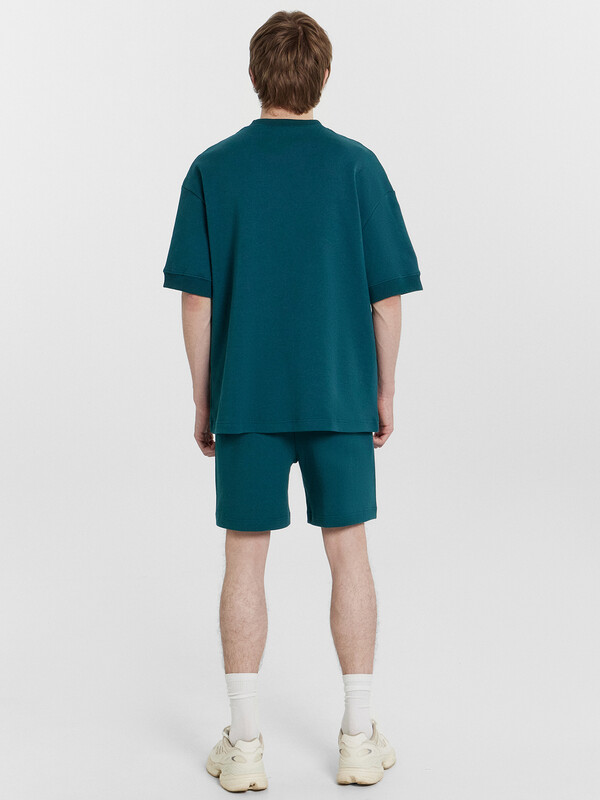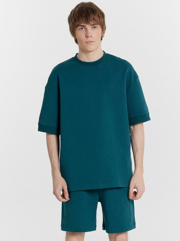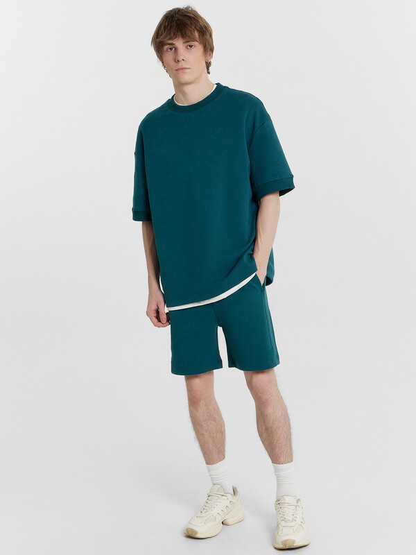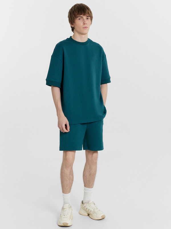Футболка свободная, прямого силуэта. Длина до середины бедер. Горловина округлой формы обработана обтачкой из рибаны.Шов вчтачивания обтачки на спинке закрыт бейкой из кулирного полотна. Плечо спущено. Рукава втачные короткие с отрезными манжетами из рибаны. По плечевым швам и шву втачивания манжеты отделочные строчки. Низ футболки обработан швом вподгибку. Шорты свободного силуэта. Длиной до колен. Пояс отрезной с эластичной тесьмой внутри. С внешней стороны пояса пробиты петли и вставлен шнур с эглетами. Боковые швы перенесены на деталь переда. В боковых швах обработаны карманы. Подкладка карманов из кулирного полотна. Нижние срезы шорт застрочены. 85% хлопок; 15% полиэстер Комментарии к товару