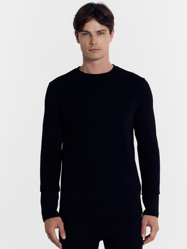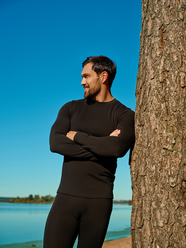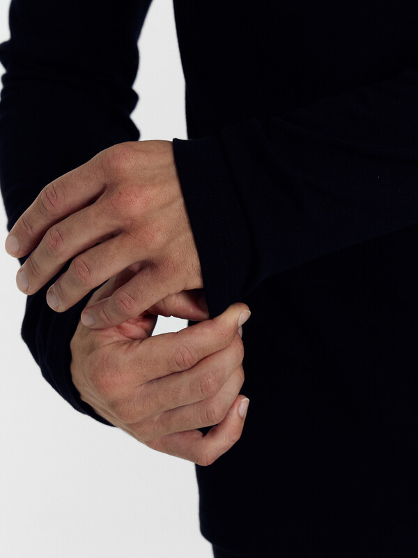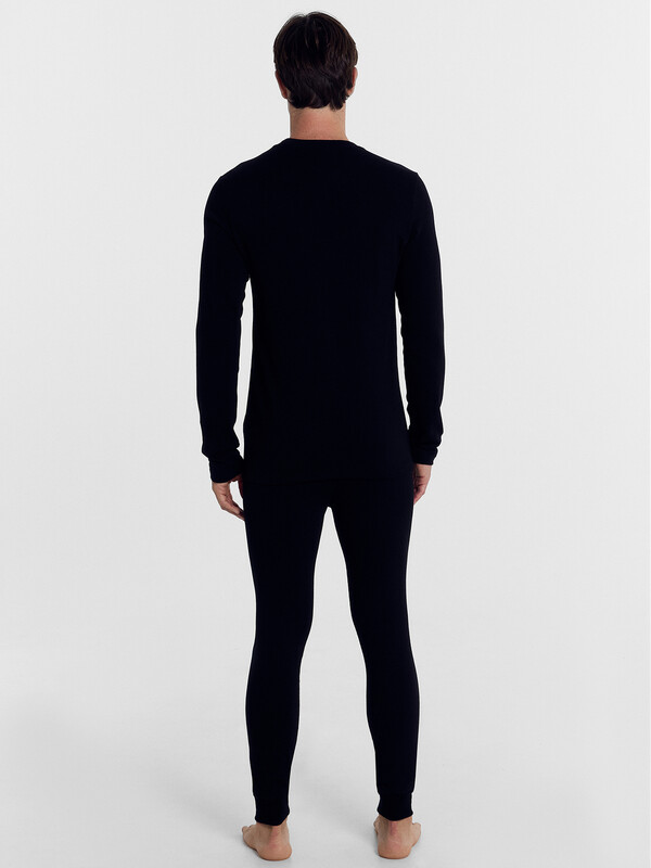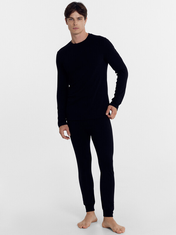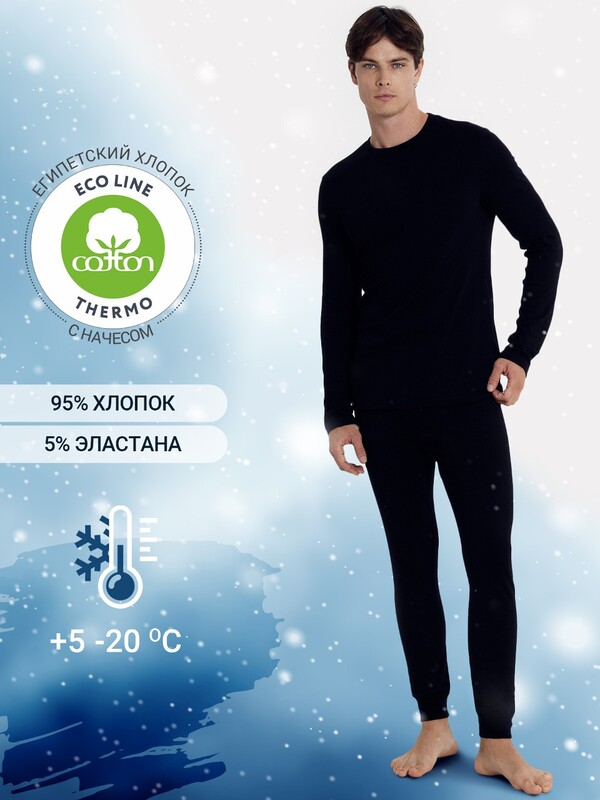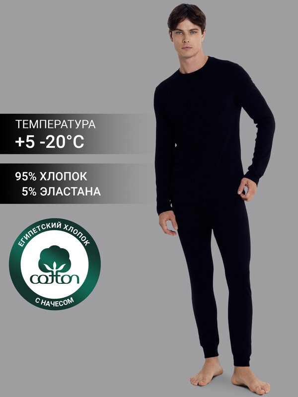Вырез круглый. Перед и спинка цельнокроенные. Рукава втачные одношовные длинные. Боковые швы распошиты на плоскошовной машине. Низ рукавов и изделия застрочены швом вподгиб на 2-хигольной плоскошовной машине. Кальсоны мужские на базе 741209 из трикотажного полотна (хлопок, эластан), плотно облегающие бедра и ноги по всей длине. На передней части усилительная планка и подкладка из 2 частей. Задняя часть со средним швом. Верхний край с эластичной фирменной трикотажной жаккардовой тесьмой, настроченной вкруговую на 2-хигольной плоскошовной машине с роликами. Нижние срезы с притачными манжетами Цвет 1 - все детали 95% хлопок; 5% эластан Комментарии к товару