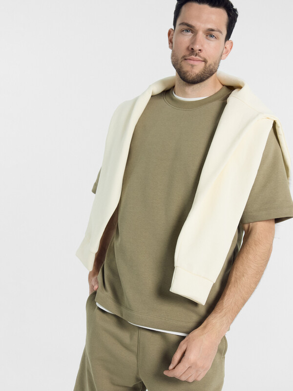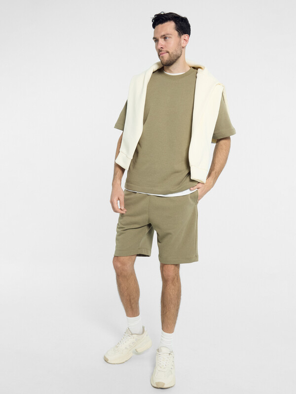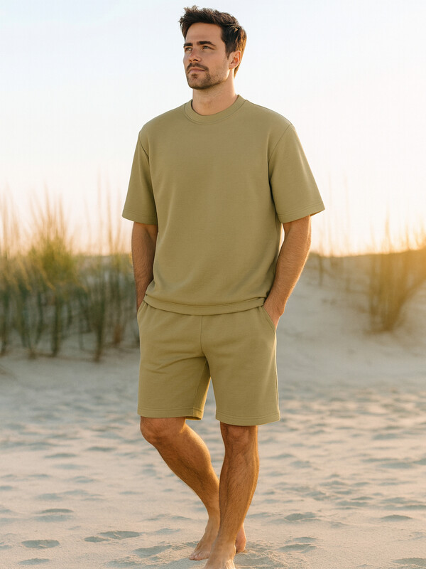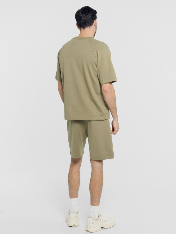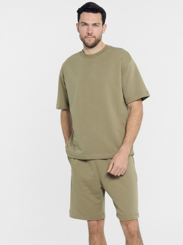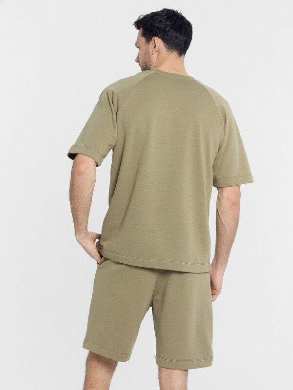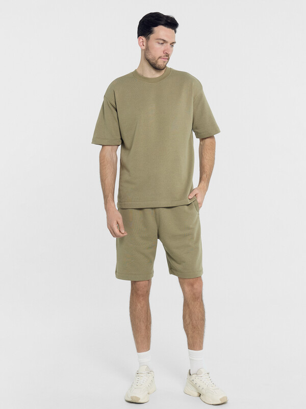 Однотонный мужской комплект из легкого хлопкового футера. Шорты прямые и свободные, длиной выше колена, с боковыми карманами и накладным сзади. Внутри пояса – эластичная тесьма и шнурок-завязка, который позволяет регулировать ширину в талии. Футболка прямая и свободная, со спущенной линией плеча и круглым вырезом. Рекомендуем!