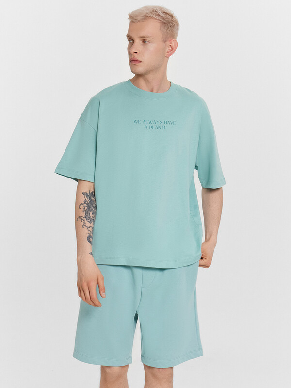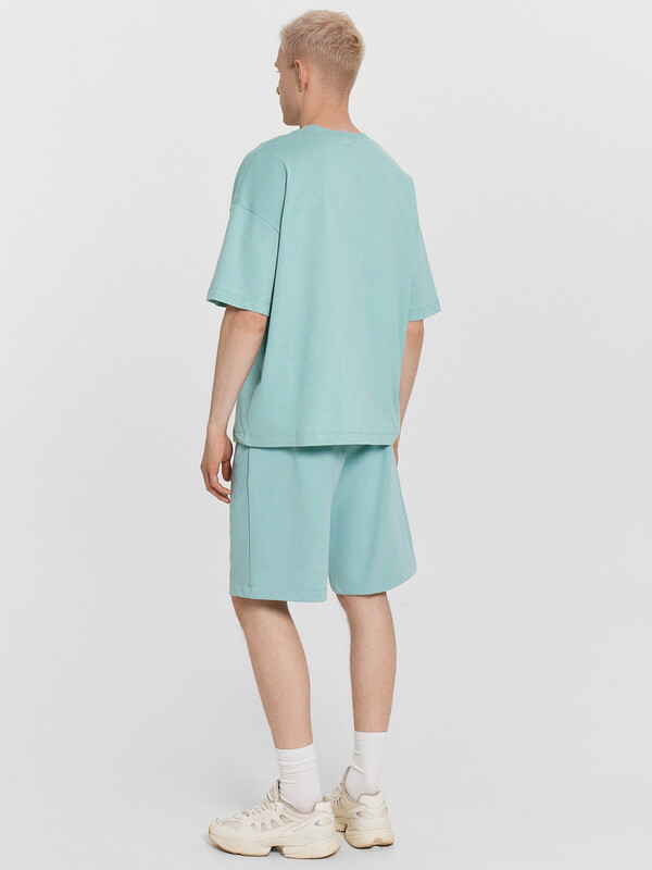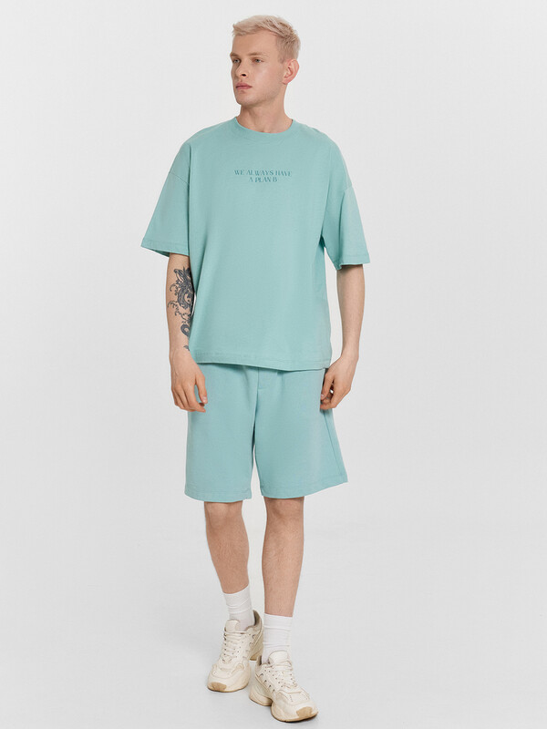 Стильный мужской комплект, состоящий из футболки и шортов. Выполнен из хлопкового полотна с добавлением полиэстера, который увеличивает прочность и долговечность одежды. Футболка силуэта оверсай, длиной до линии бедер. Спущенная линия плеча дарит свободу движений. Шорты прямые и свободные, длиной до колена, с эластичной тесьмой в поясе и удобными боковыми карманами. Регулировать ширину в талии можно с помощью шнурка-завязки. Рекомендуем!