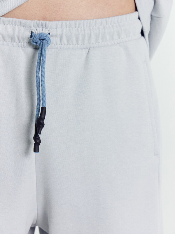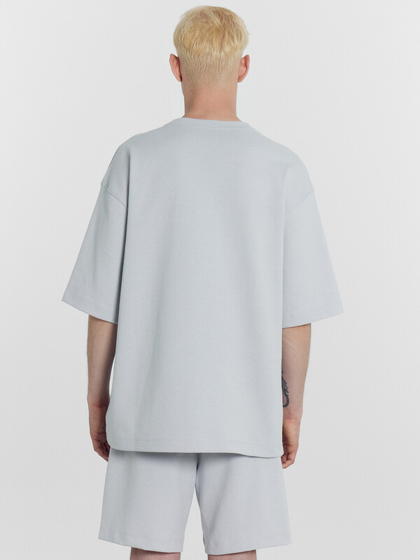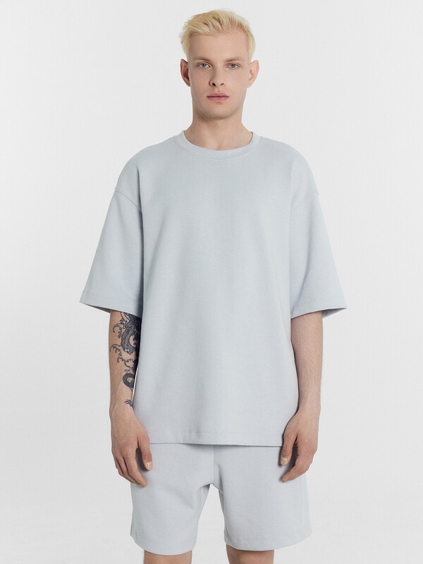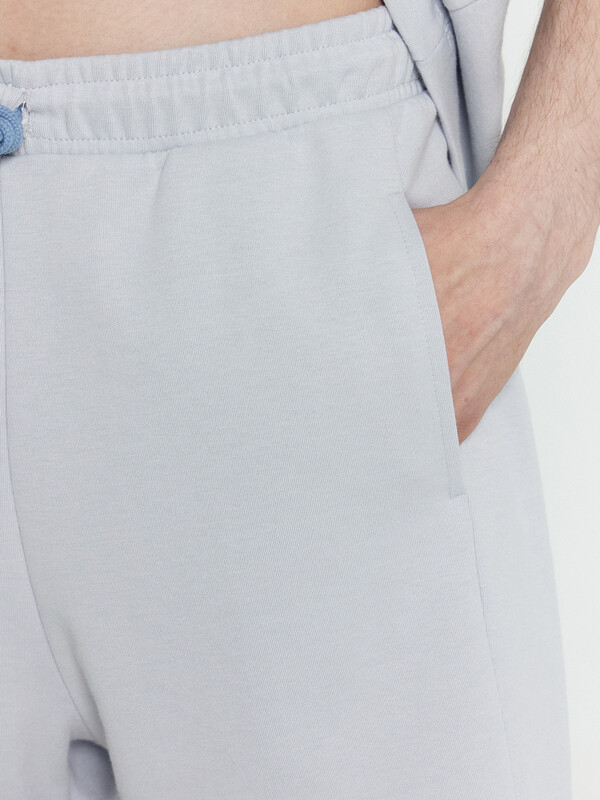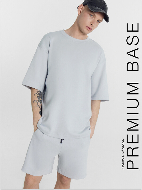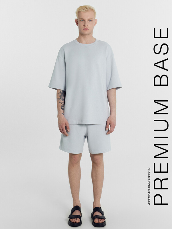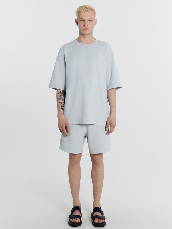 Футболка прямая свободная. Горловина округлой формы обработана обтачкой из основного полотна. Линия плеча слегка спущена. Рукава втачные, корткие. Нижние срезы футболки и рукавов обработаны швом вподгибку на 2х игольной плоскошовной машине. Шорты прямые свободные, длиной до колен. Пояс отрезной с эластичной тесьмой внутри. С внешней стороны пояса пробиты петли и втянут шнур (8КXW-1 8мм) с узлом на концах и с термоусадочной трубкой. Боковые швы смещены в сторону переда. В швах обработаны карманы. Нижние срезы обработаны швом вподгибку на 2х игольной плоскошовной машине. 85% хлопок; 15% полиэстер Комментарии к товару