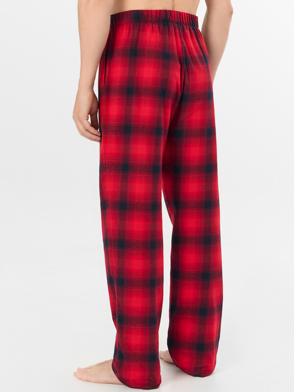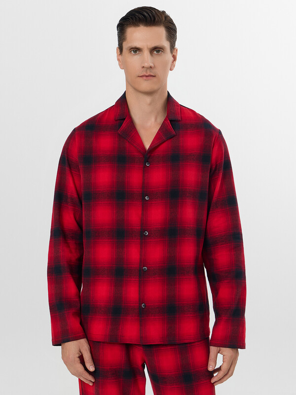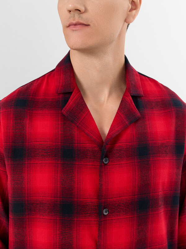 Мужской домашний комплект в классическую клетку станет идеальным спутником для отдыха. Пижама, состоящая из рубашки и брюк, выполнена из хлопка, который дарит коже приятные ощущения и обеспечивает комфорт весь день. Свободная рубашка прямого силуэта с V-образным вырезом и отложным воротником выглядит элегантно и не сковывает движений. Длинные рукава со спущенным плечом и аккуратно обработанными манжетами дополняют образ. Прямые брюки с удобным цельнокроеным поясом на эластичной тесьме мягко сидят по фигуре. Практичные боковые карманы и аккуратная обработка низа подчеркивают качество исполнения.