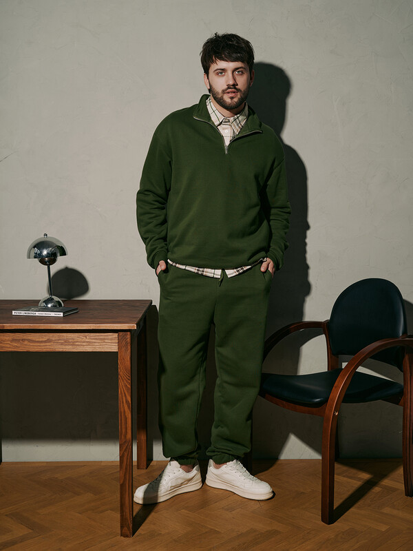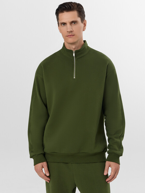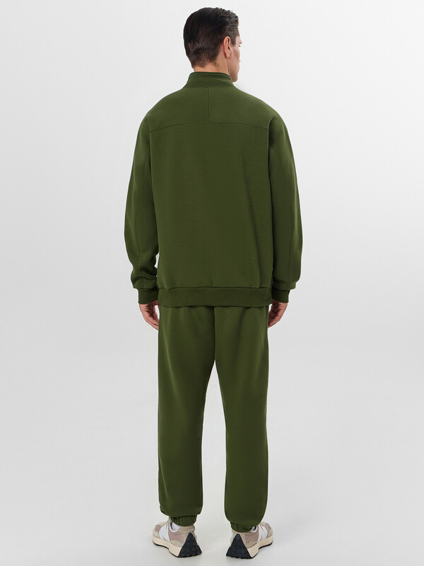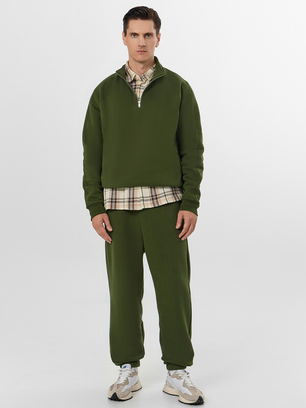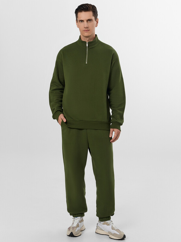 Толстовка свободного силуэта. Горловина круглой формы с отрезным воротником стойкой из основного полотна. Рукава втачные длинные. Линия плеча слегка спущена. По низу рукавов отрезные манжеты из рибаны. По спинке отрезная кокетка, состоящая из двух частей, цельнокроёная с верхней частью рукавов. Центральная застежка на молнию. По низу изделия отрезной пояс из рибаны. Брюки свободного силуэта. Посадка средняя. Сидение немного спущено. На передних деталях карманы в боковых швах. Подкладка карманов из кулирки. Пояс отрезной с эластичной тесьмой. По переду в поясе пробиты петли и протянут шнур 8 EKXWC-1, 8 мм с эглетом. Низ брюк обработан вподгибку с эластичной тесьмой. 65% хлопок; 35% полиэстер Комментарии к товару