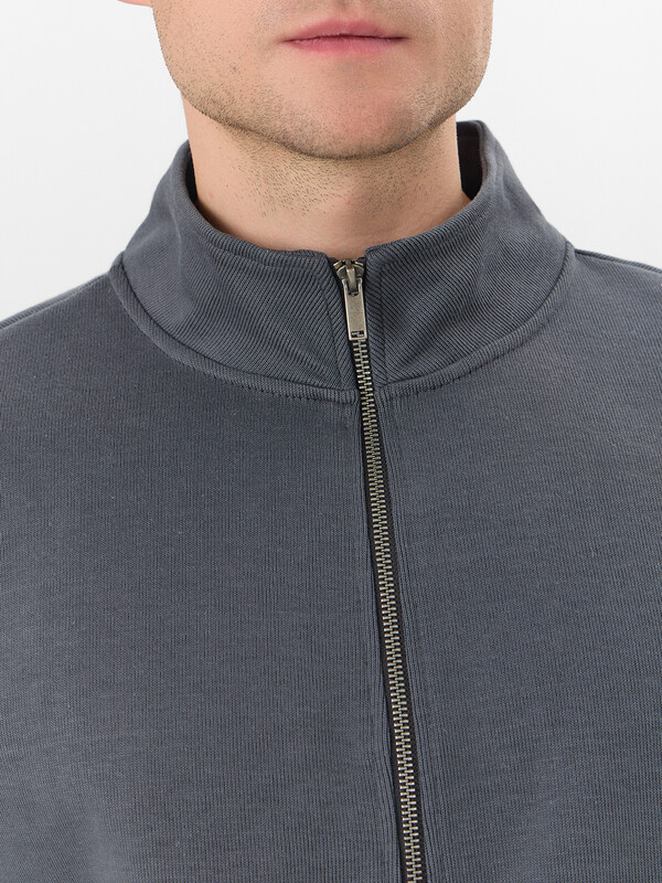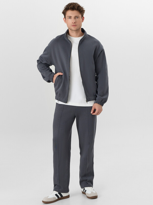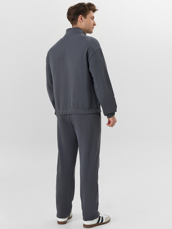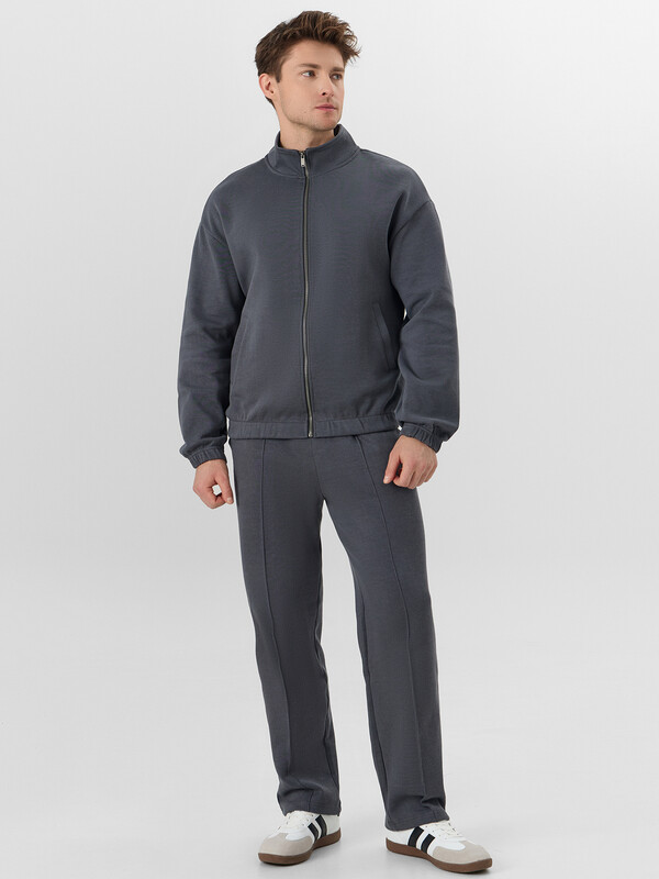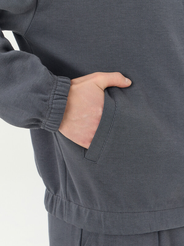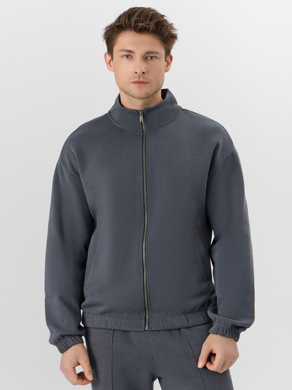 Толстовка прямого силуэта, с центральной застежкой на металлическую тесьму-молнию. Перед с прорезными карманами с листочкой. Плечо слегка спущено.