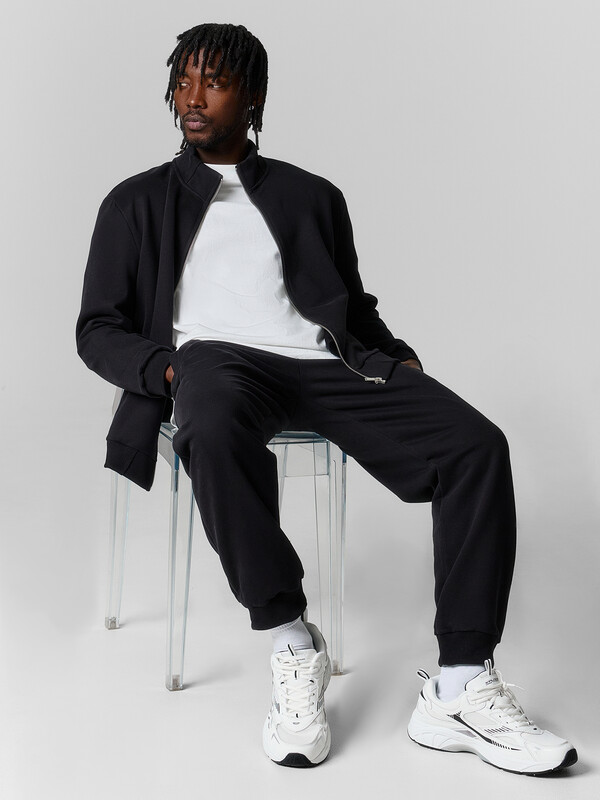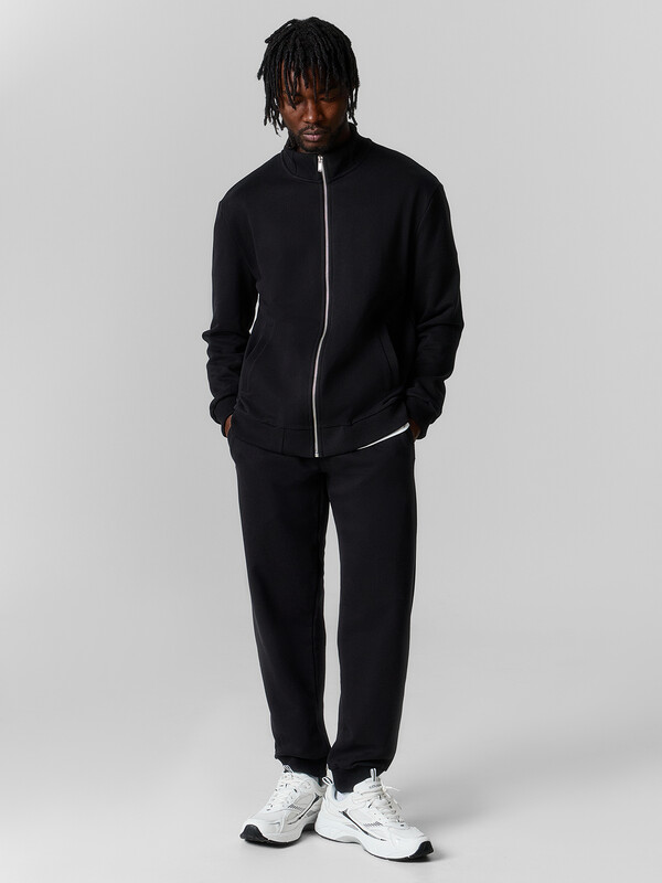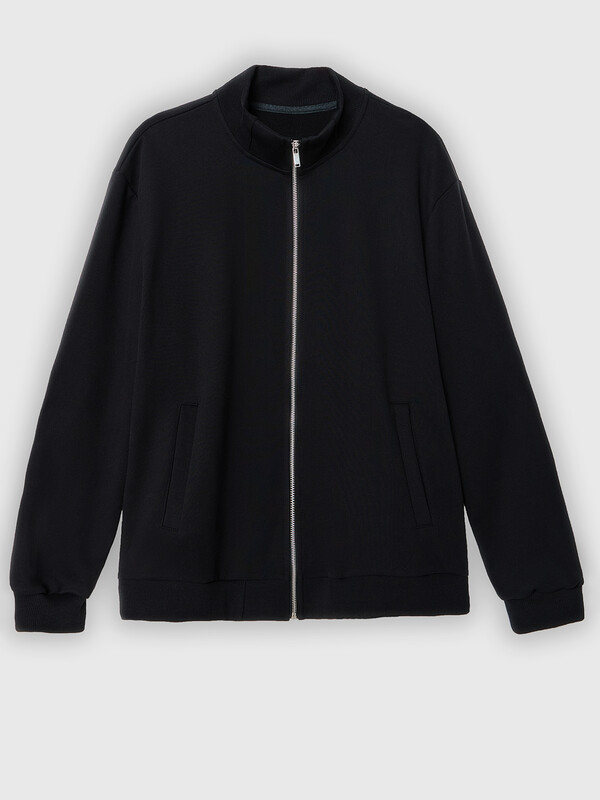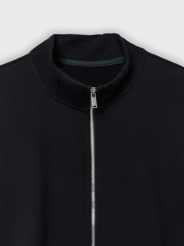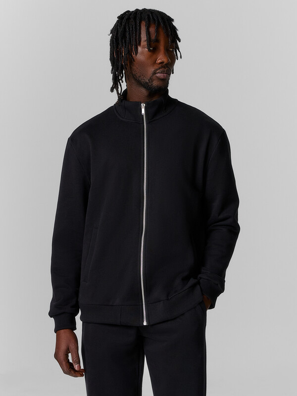 Толстовка прямого силуэта, с центральной застежкой на тесьму-молнию. Вдоль застежки-молнии отделочные строчки. Перед с прорезными карманами с листочкой. Плечо слегка спущено.