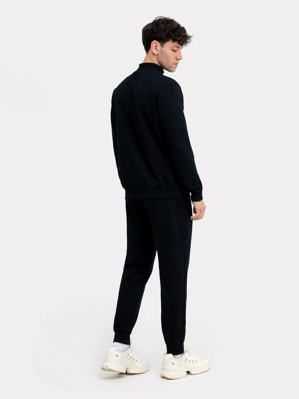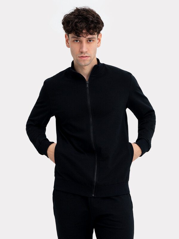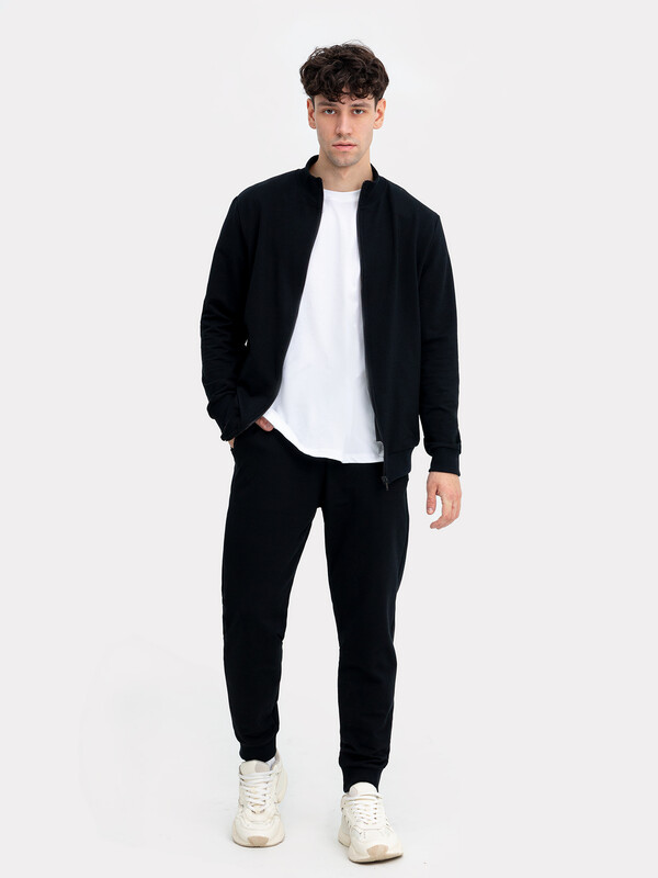 Комплект изготовлен из трикотажного полотна футер. Жакет прямого силуэта, длиной до середины бедер. Горловина округлой формы с воротником стойкой из рибаны. Рукав втачной, длинный с отрезными манжетами.