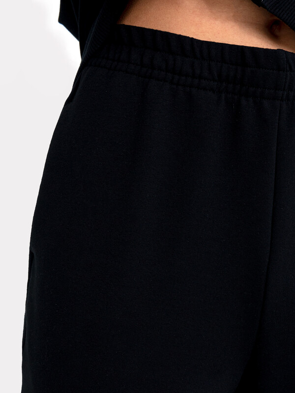 По переду обработаны карманы-хулиганы. По низу брюк отрезные манжеты из рибаны.