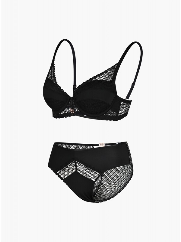 Кружевной бюстгальтер черного цвета выполнен из мягкого и легкого полиамидного материала, который обеспечивает комфортную посадку и не вызывает раздражения на коже. Модель украшена рельефными кружевными узорами. Сетчатые чашки бюстгальтера без дополнительной поддержки груди хорошо пропускают воздух, позволяя коже дышать, а благодаря тонким бретелям модель можно регулировать под индивидуальные параметры. Желаемая степень обхвата груди достигается с помощью трех крючков на задней части бюстгальтера.