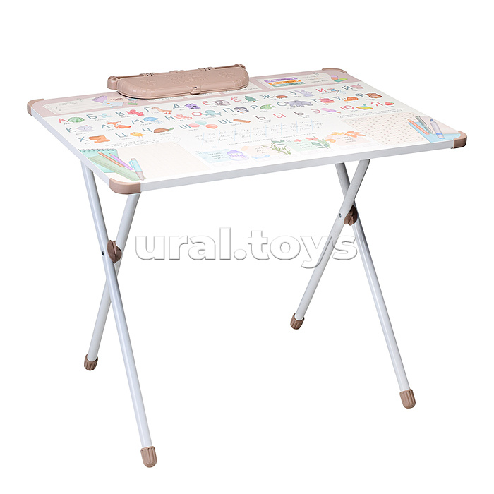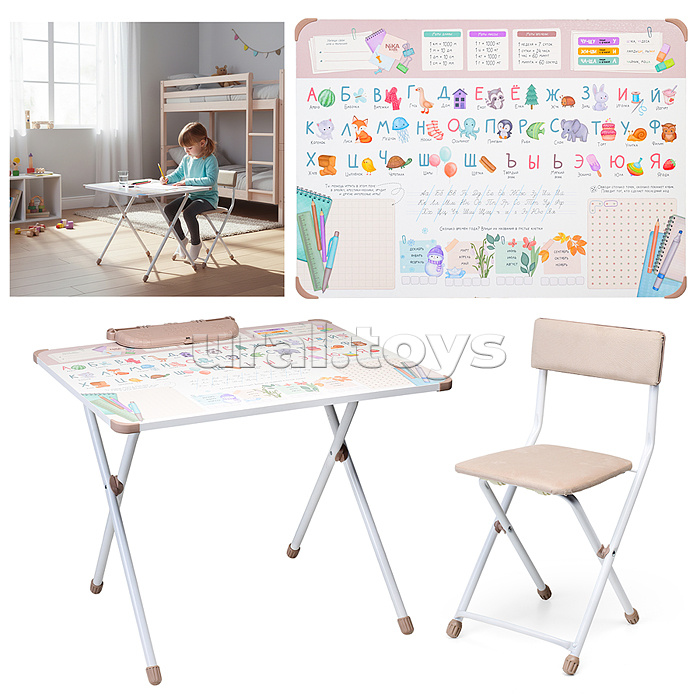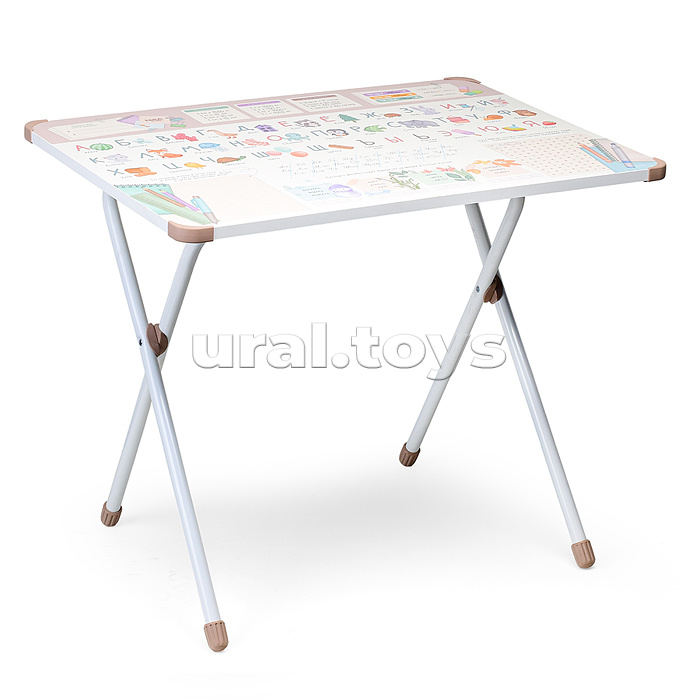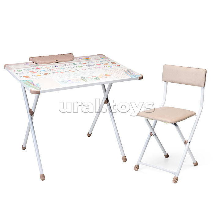 Комплект складной мебели, состоящий из стула, стола c увеличенным размером столешницы. Для детей в возрасте от 3 до 7 лет.