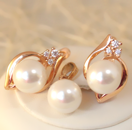 Комплект с золотым покрытием. Материал: бижутерный сплав. Покрытие: золото 18К. Вставка:  фианиты, иск. жемчуг. Застёжка: английский замок. Размер серьги: 1,7 см. Размер кулона: 1,8 см. (с ушком)