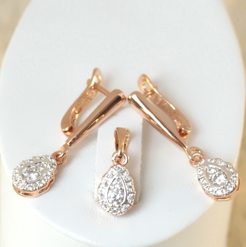 Комплект с золотым покрытием. Материал: бижутерный сплав. Покрытие: золото 18К. Вставка: фианиты. Застёжка: английский замок. Размер серьги: 2,7 см. Размер кулона: 1,6 см. (с ушком)