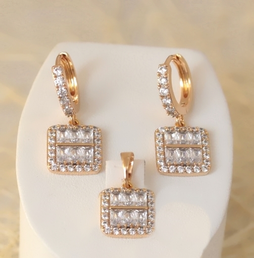 Комплект с золотым покрытием. Материал: бижутерный сплав. Покрытие: золото 18К. Вставка:  фианиты. Застёжка: круглый замок. Размер серьги: 2,5 см. Размер кулона: 1,9 см. (с ушком)