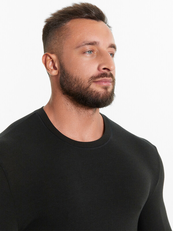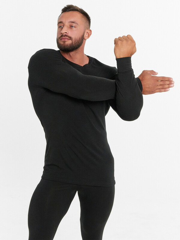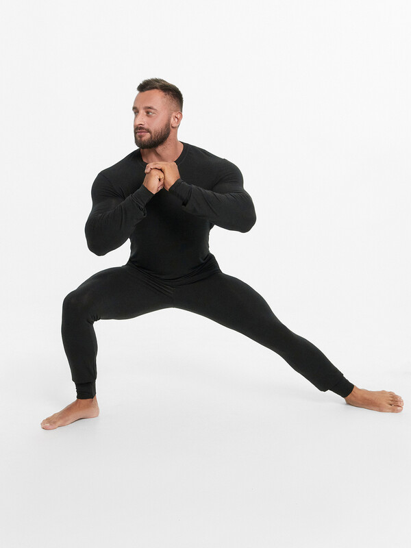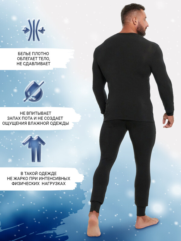 Мужской термо-компдект из полуприлегающего джемпера длиной до линии бедер и облегающих брюк. Рукава джемпера длинные, на манжетах, горловина круглая. Брюки без боковых швов, на манжетах, с эластичной тесьмой в поясе. Все швы плоские и комфортные. В состав полотна, созданного по японской технологии, входит микроакрил, который благодаря своей толщине (меньше волоса человека в 10 раз), создает своеобразные воздушные карманы между нитями – именно за счет этого свойства джемпер так хорошо согревает. Благодаря эффекту натуральной шерсти выдерживает температуры до -30 градусов Цельсия. Зиму контролируете вы!