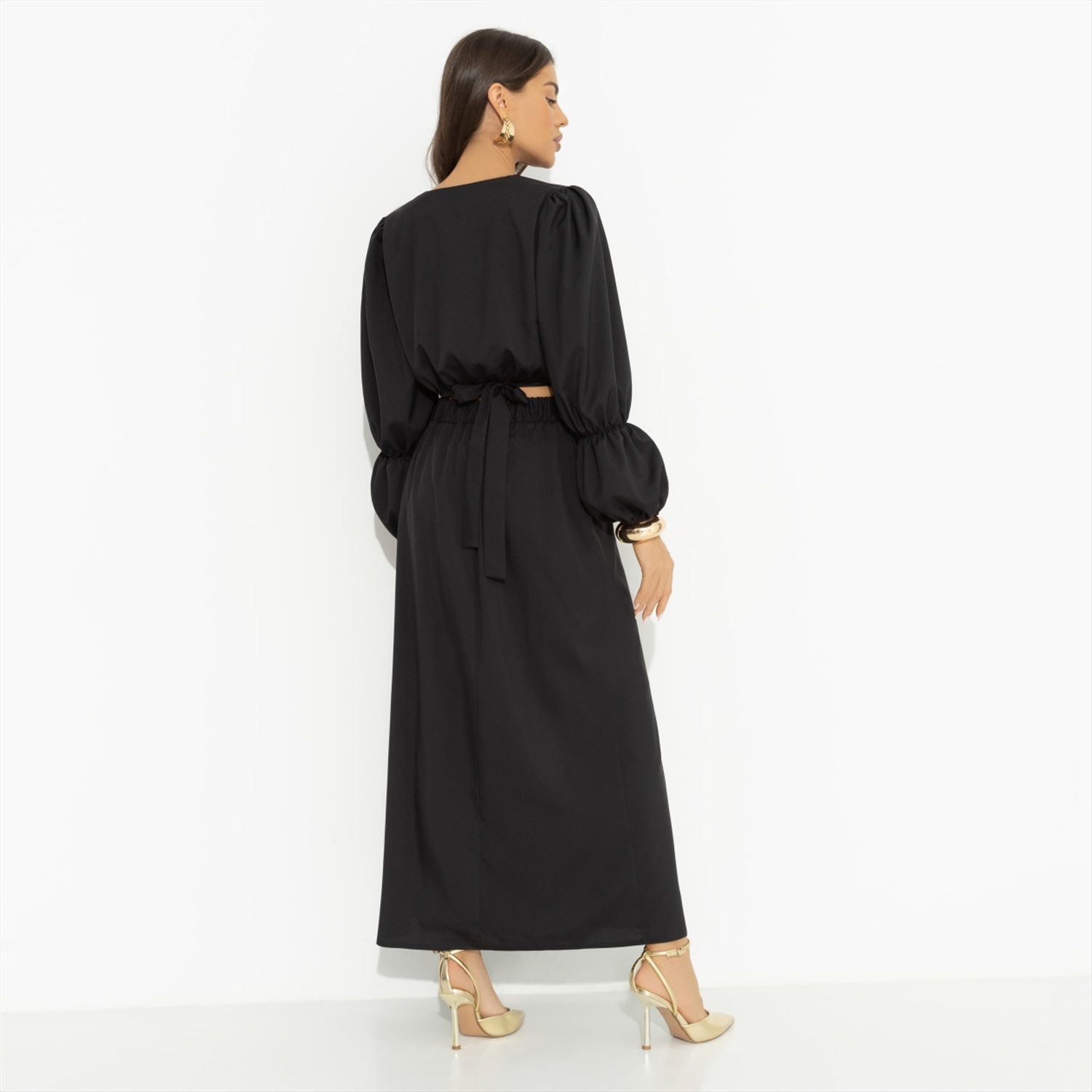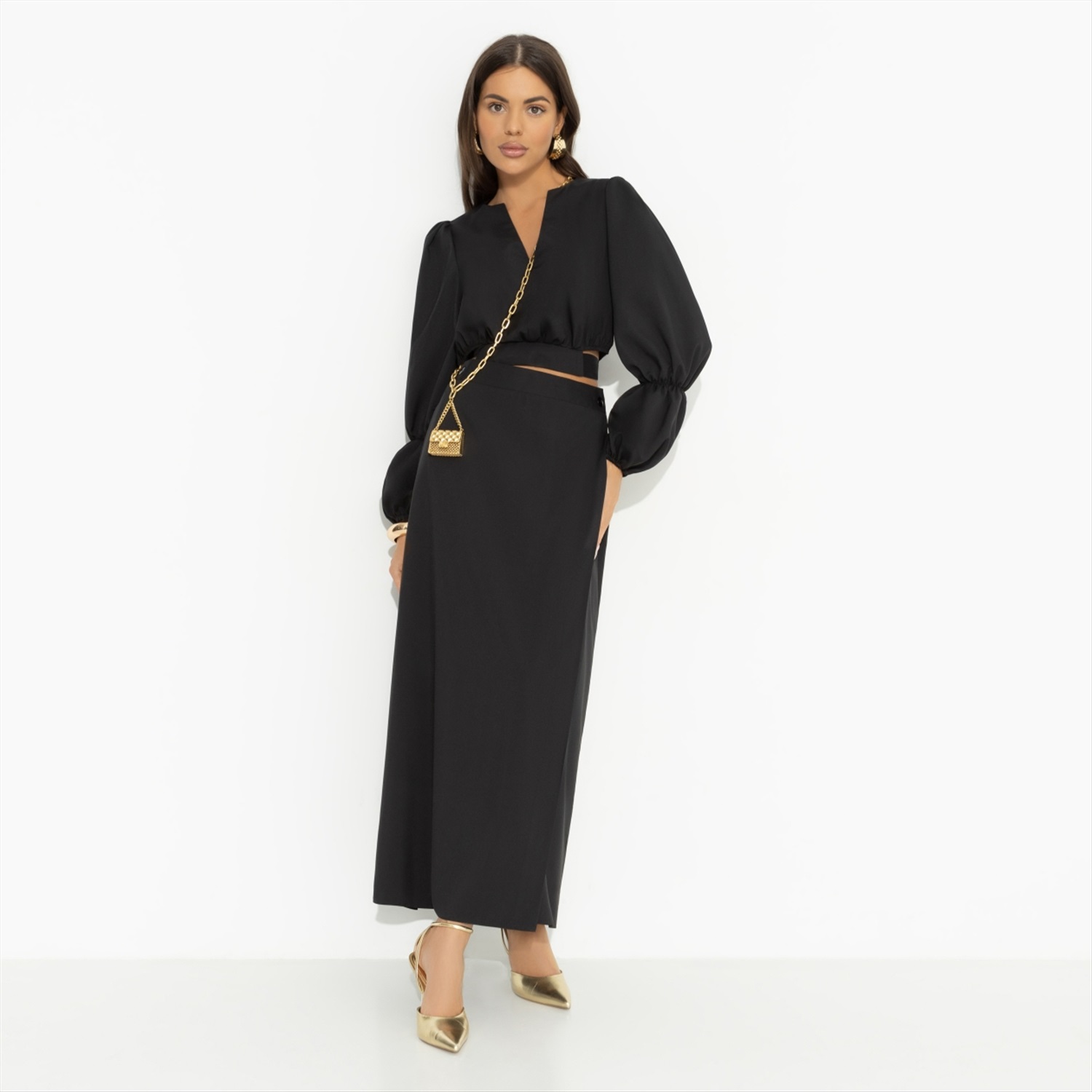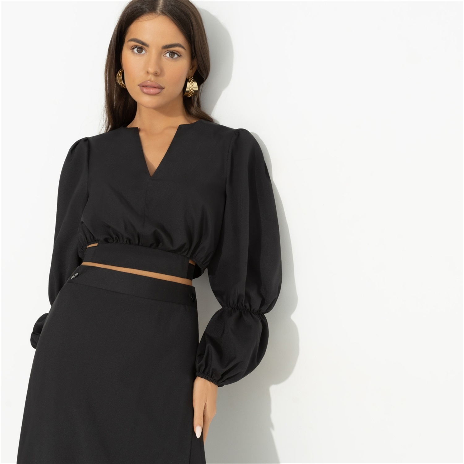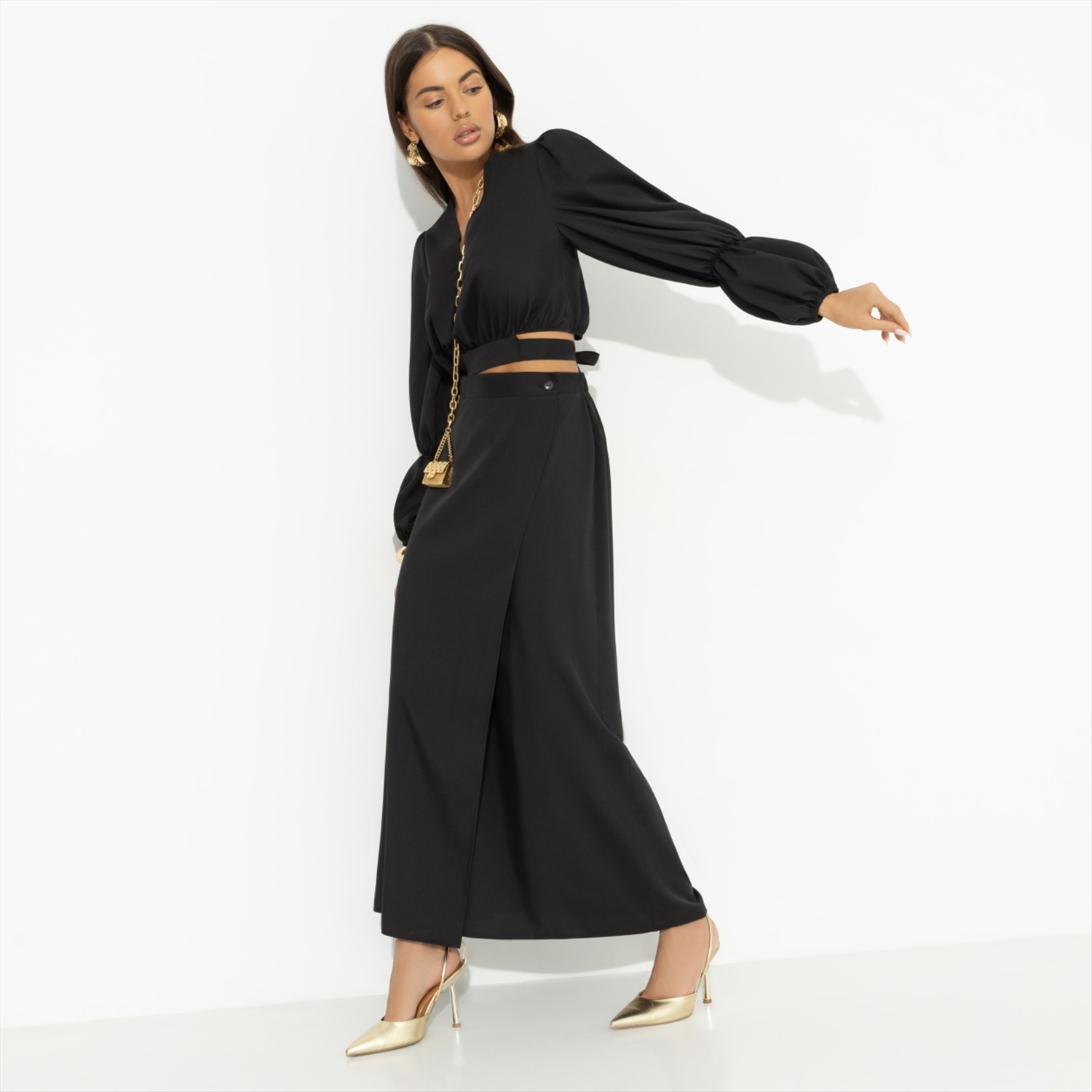 Когда хочешь вау-эффекта, приходи к нему на работу в разгар дня в костюме CHARUTTI. Быть может у него совещание, тогда тихонько постучись. Это мы называем сверхважные обстоятельства. Тебе нельзя отказать. Комплект состоит из укороченной блузы и юбки в длине миди. Юбка струящаяся, на запах. Есть глубокий разрез. Посадка чуть ниже талии. Пояс на пуговице, по спинке вшита резинка. Подол блузы акцентный. Часть оформлена вшитой резинкой, часть – широким поясом с завязками на спине. Есть тонкие вшитые резинки по длине рукава.