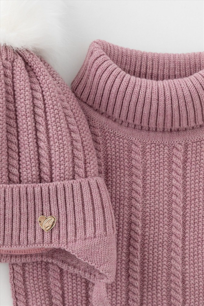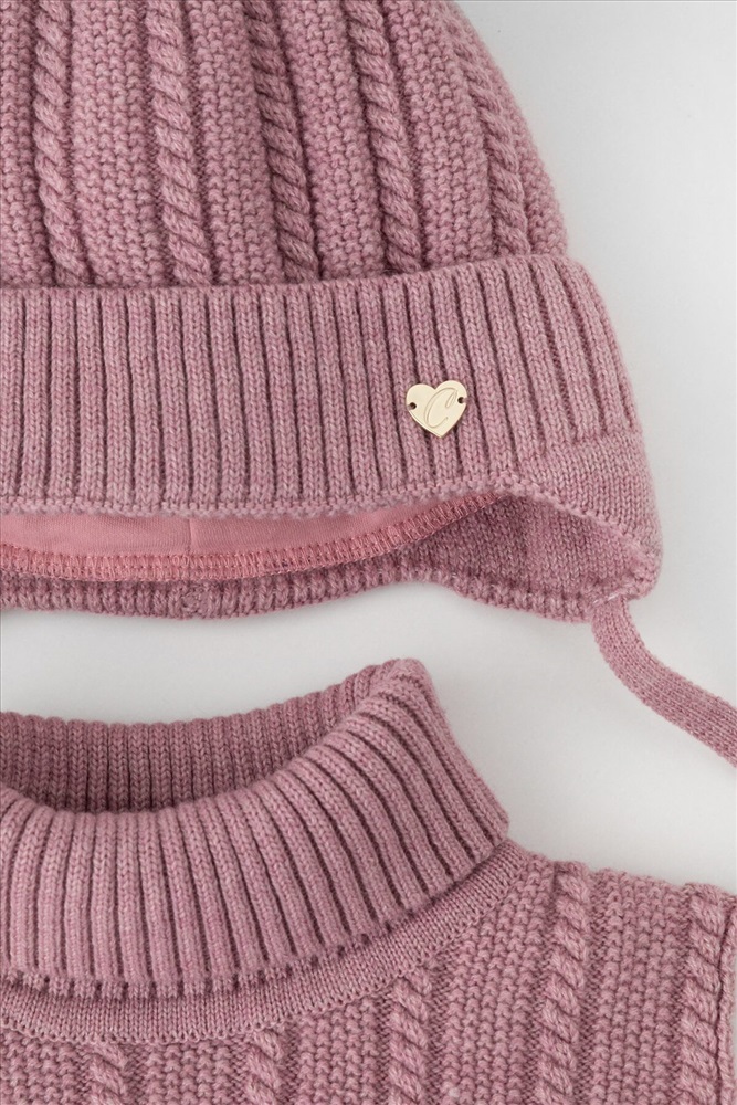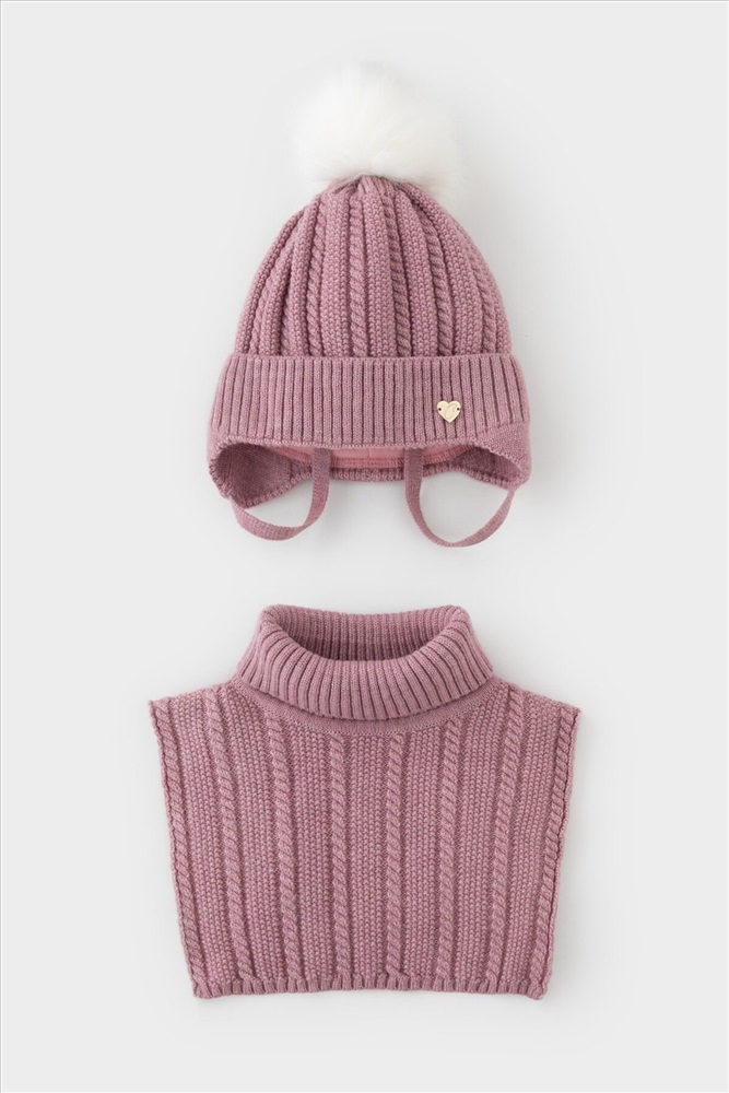 Комплект для девочки: шапка и манишка из полушерстяной пряжи. Шапка на завязках с синтепоновым утеплителем. Подклад из натурального хлопка. Полностью закрывает голову, уши и шею, защищая ребёнка от холодного воздуха и ветра. На макушке помпон. Манишка с высоким воротником с эластичным отворотом.