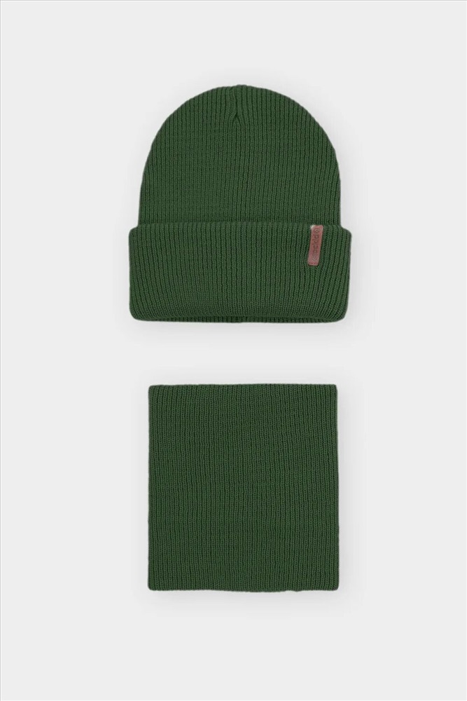 Комплект детский: шапка и снуд из полушерсти. Тёплая шапка с отворотом, украшена нашивкой из искусственной кожи. Снуд без оборотов вокруг шеи. Изделие сохраняет форму и стойкий цвет после многочисленных стирок.