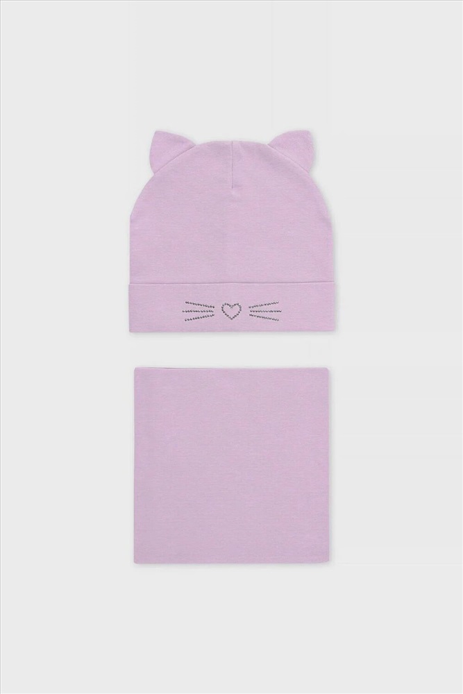 Комплект для девочки: шапка и снуд из хлопкового трикотажа с добавлением эластана, окрашенного стойкими гипоаллергенными текстильными красителями. Изделия хорошо тянутся, после многократных стирок сохраняют цвет и форму.