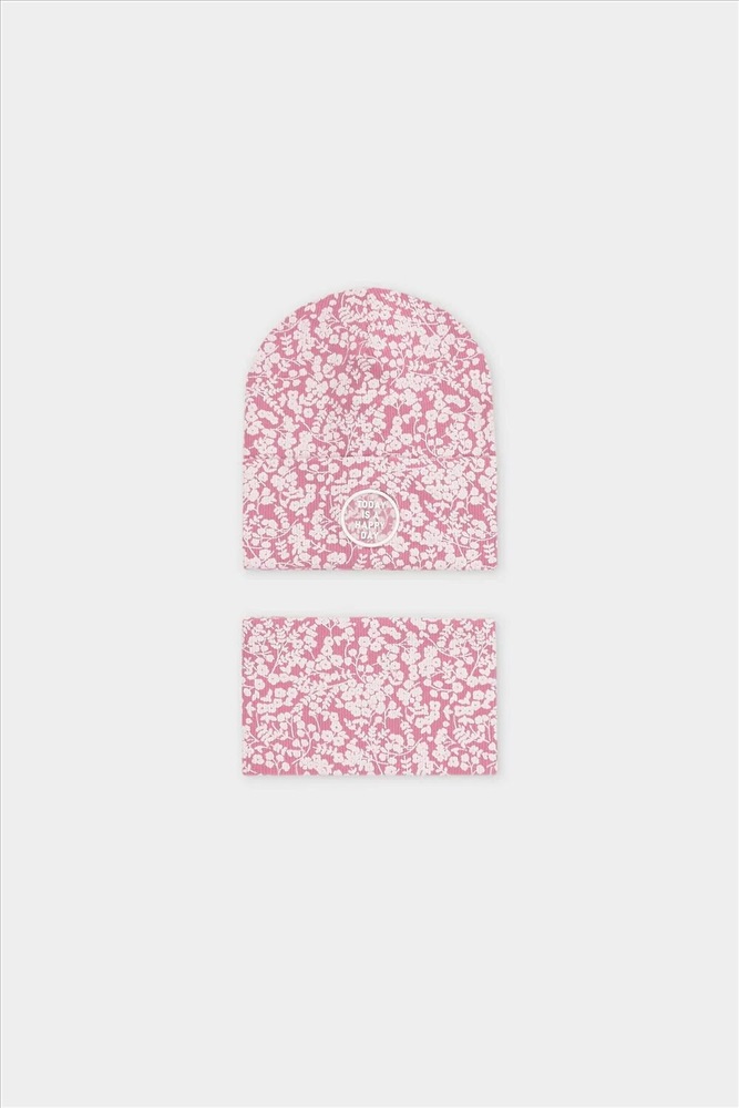 Комплект для девочки: шапка и снуд из хлопкового трикотажа в рубчик с добавлением эластана. Набивка выполнена из стойких гипоаллергенных красителей. Изделия хорошо тянутся, после многократных стирок сохраняют цвет и форму.