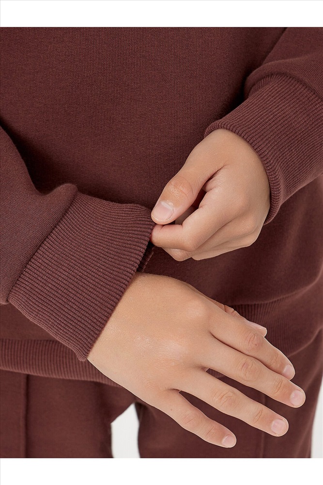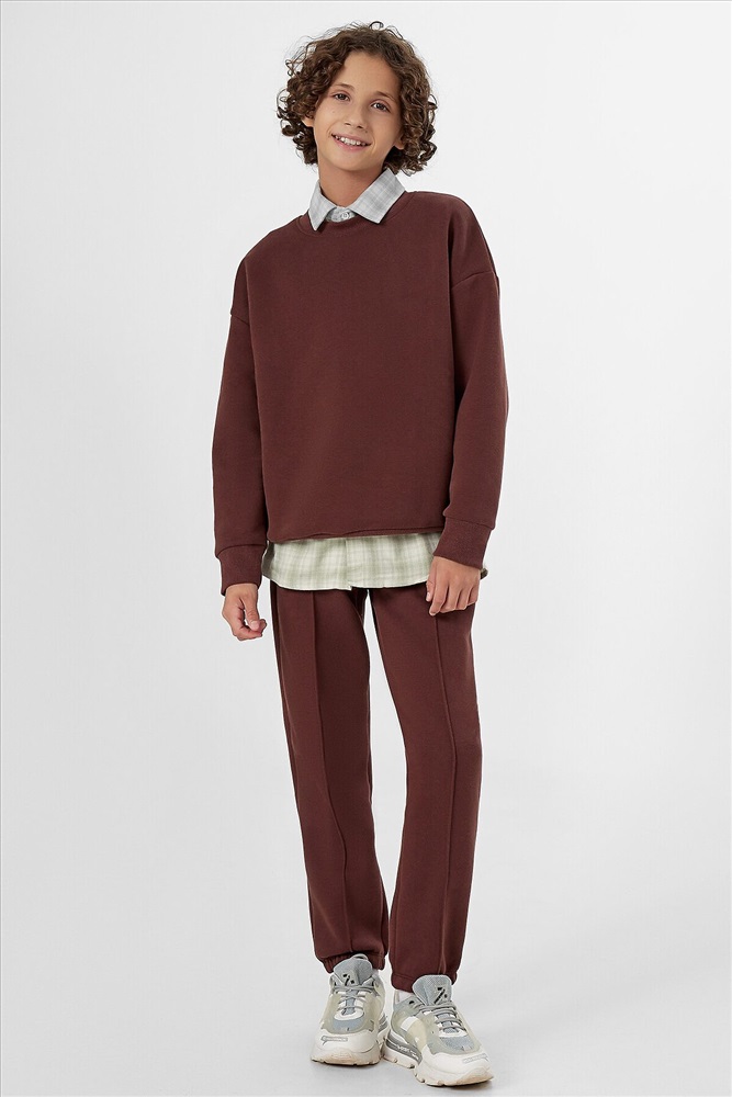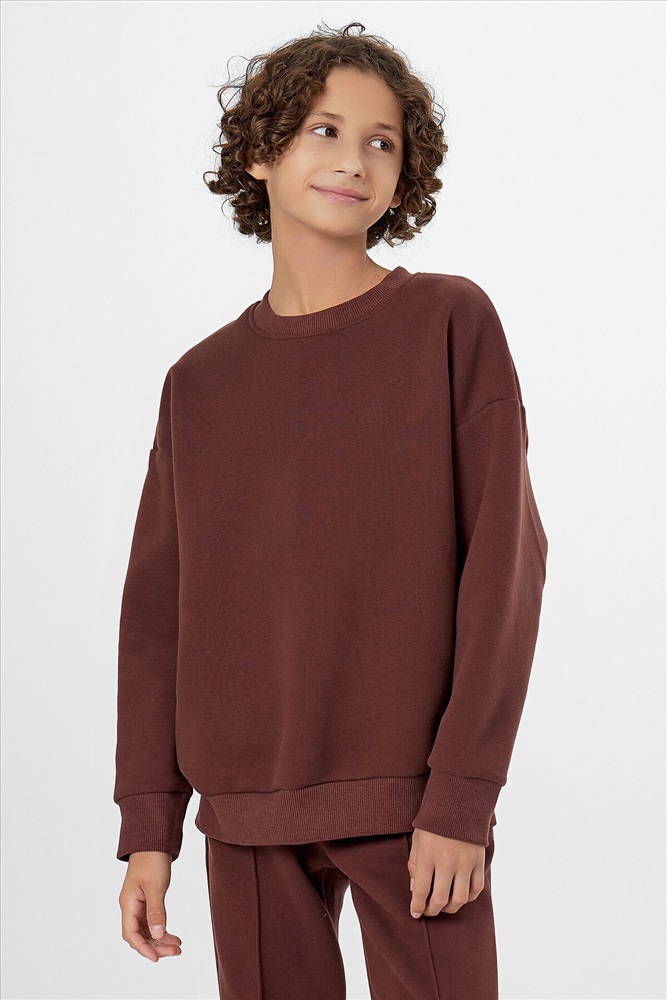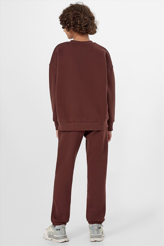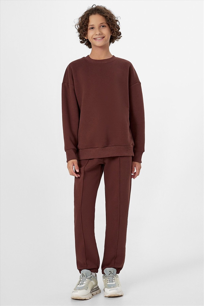 Стильный повседневный комплект для мальчика в коричневом цвете – идеальный вариант для активного отдыха и прогулок. Набор включает удобный свитшот и практичные брюки-джогеры, выполненные из мягкого футера с подчесом, который обеспечивает комфорт в течение всего дня.
