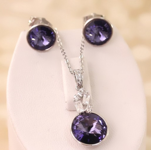 Комплект с покрытием родий. Материал: бижутерный сплав. Покрытие: родий. Вставка: австрийские кристаллы. Размер камня: кулон - 1,1 см. серьги - 0,9 см Цвет камня: фиолетовый.