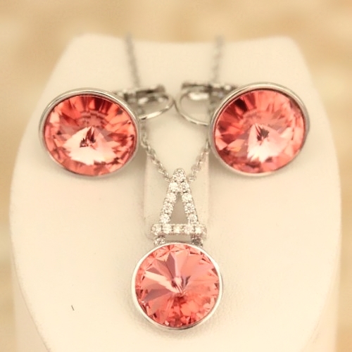 Комплект с покрытием родий. Материал: бижутерный сплав. Покрытие: родий. Вставка: австрийские кристаллы. Размер серьги: 1,9 см. Длина цепочки: 40-45 см. Размер камня: серьги - 1,3 см. (с ободком) кулон - 1,1 см.(с ободком) Цвет камня: розовый.