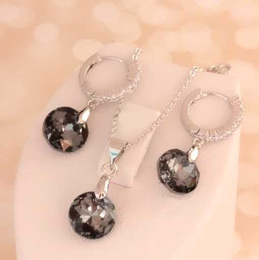 Комплект с покрытием родий. Материал: бижутерный сплав. Покрытие: родий. Вставка: австрийские кристаллы. Размер серьги: 2,9 см. Размер камня: серьги -1 см. Кулон - 1 см. Цвет камня: серый. Длина цепочки: 45-50 см.