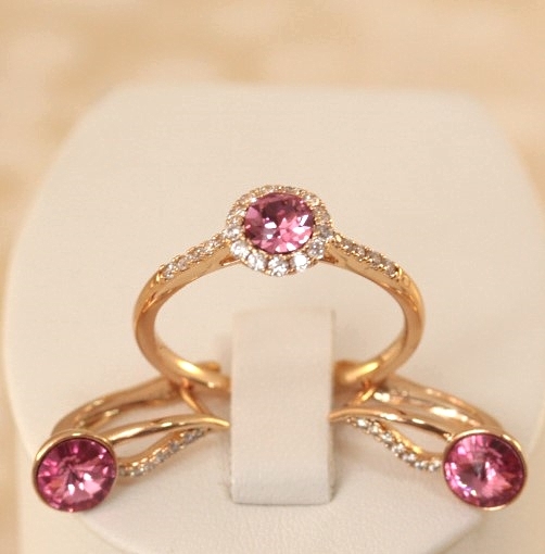Комплект с покрытием золота. Материал: бижутерный сплав. Покрытие: золото 18К. Вставка: австрийские кристаллы. Размер серьги: 1,6 см. Размер камня: серьги - 0,7 см кольцо - 0,8 см. (с ободком) Цвет камня: ярко-розовый.