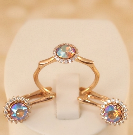 Комплект с покрытием золота. Материал: бижутерный сплав. Покрытие: золото 18К. Вставка: австрийские кристаллы. Размер серьги: 1,7 см. Размер камня: серьги - 0,8 см (с ободком) кольцо - 0,8 см. (с ободком) Цвет камня: хамелеон.