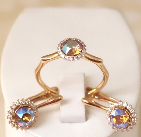 Комплект с  покрытием золота. Материал: бижутерный сплав. Покрытие: золото 18К. Вставка: австрийские кристаллы. Размер серьги: 1,7 см. Размер камня: серьги - 0,8 см (с ободком)  кольцо - 0,8 см. (с ободком) Цвет камня: хамелеон.