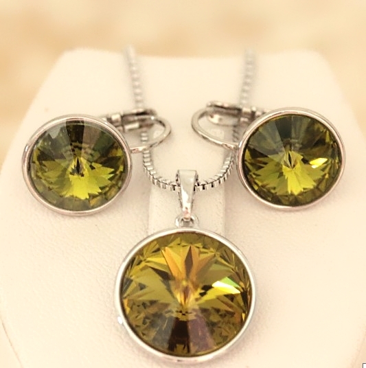 Комплект с покрытием родий. Материал: бижутерный сплав. Покрытие: родий. Вставка: австрийские кристаллы. Размер серьги: 1,8 см. Длина цепочки: 40-45 см. Размер камня: серьги - 1,2 см. (с ободком) кулон - 1,5 см. (с ободком) Цвет камня: оливковый.