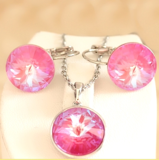 Комплект с покрытием родий. Материал: бижутерный сплав. Покрытие: родий. Вставка: австрийские кристаллы. Размер серьги: 1,9 см. Длина цепочки: 40-45 см. Размер камня: серьги - 1,4 см. кулон - 1,5 см.(с ободком) Цвет камня: хамелеон.
