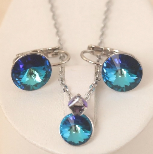 Комплект с покрытием родий. Материал: бижутерный сплав. Покрытие: родий. Вставка: австрийские кристаллы. Размер серьги: 1,8 см. Длина цепочки: 40-45 см. Размер камня: серьги - 1 см. кулон - 0,8 см. Цвет камня: морская волна.