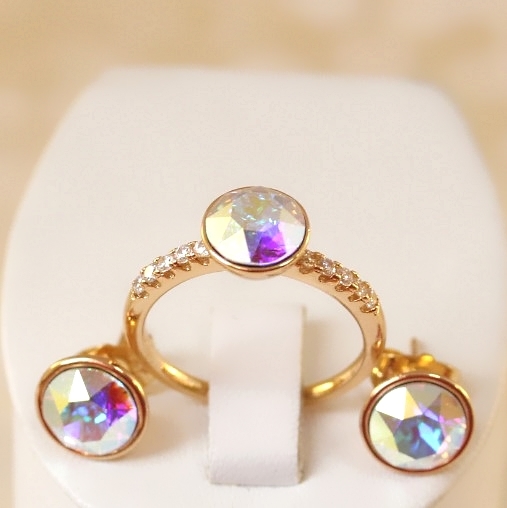 Комплект с покрытием золота. Материал: бижутерный сплав. Покрытие: золото 18К. Вставка: австрийские кристаллы. Размер камня: серьги - 0,9 см. (с оправой), кольцо: 0,9 см. Цвет камня: хамелеон.