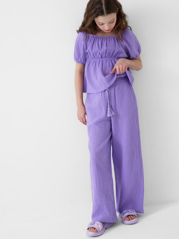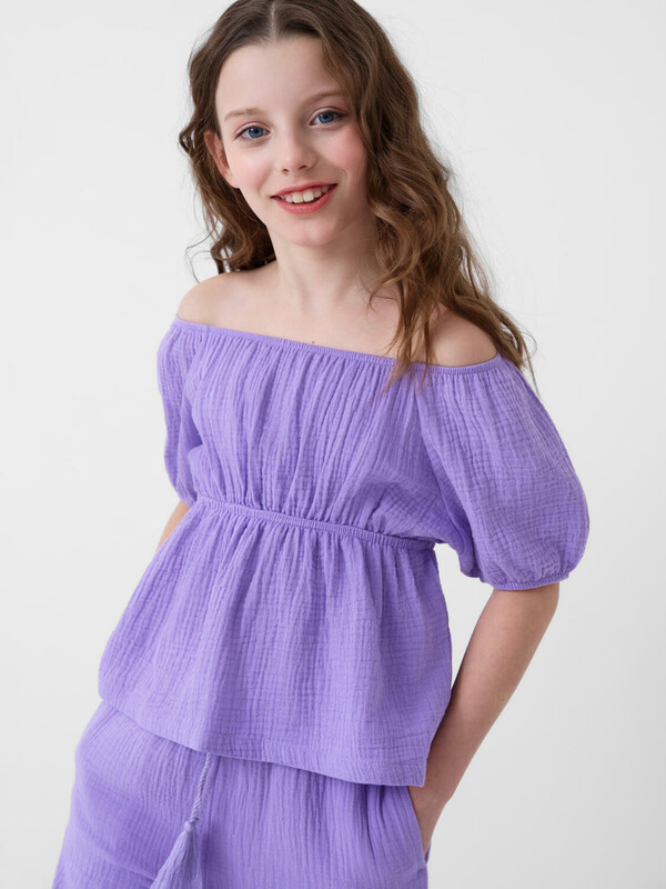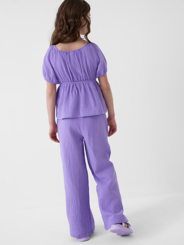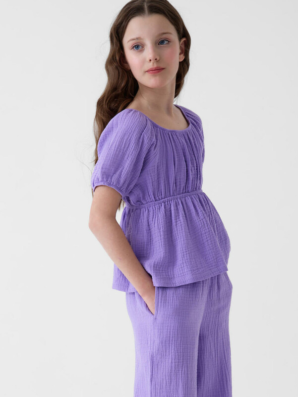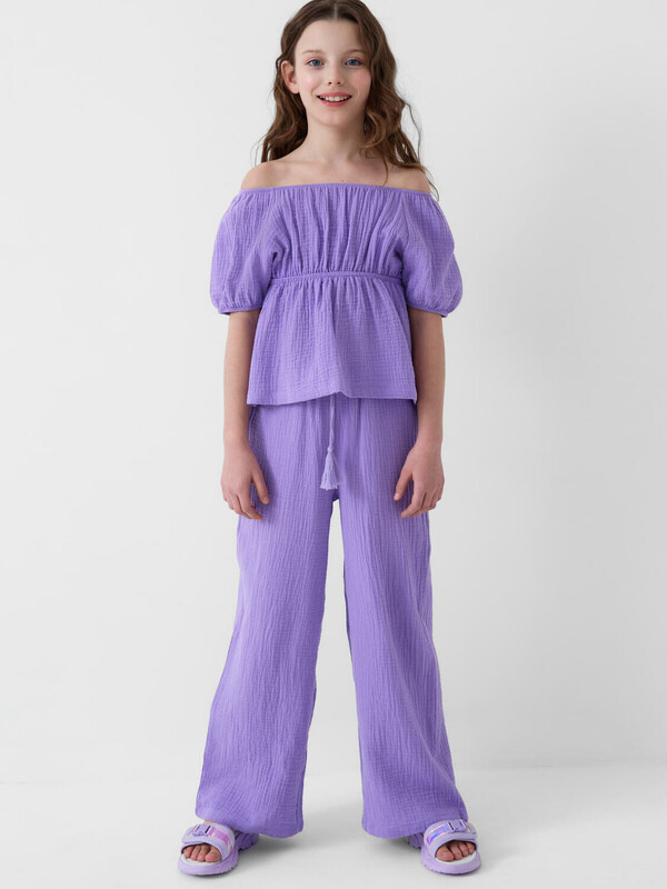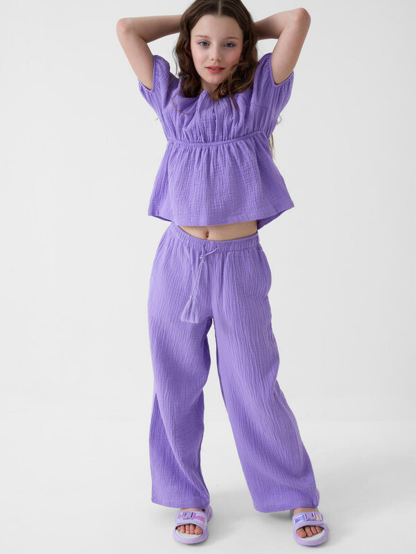 Производитель: PlayToday Легкий летний комплект для девочки подростка. Состоит из укороченной блузки и широких брюк. Материал – мягкий хлопковый муслин, дышащий и приятный к телу. Блузка с пышными короткими рукавами и сборкой на резинке по талии, что создает аккуратную и женственную форму. Брюки – длинные и свободные, с высокой посадкой и резинкой на поясе. По бокам — удобные карманы.