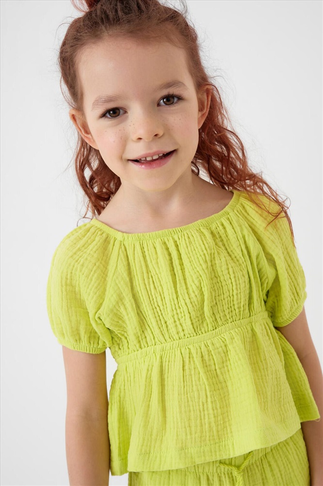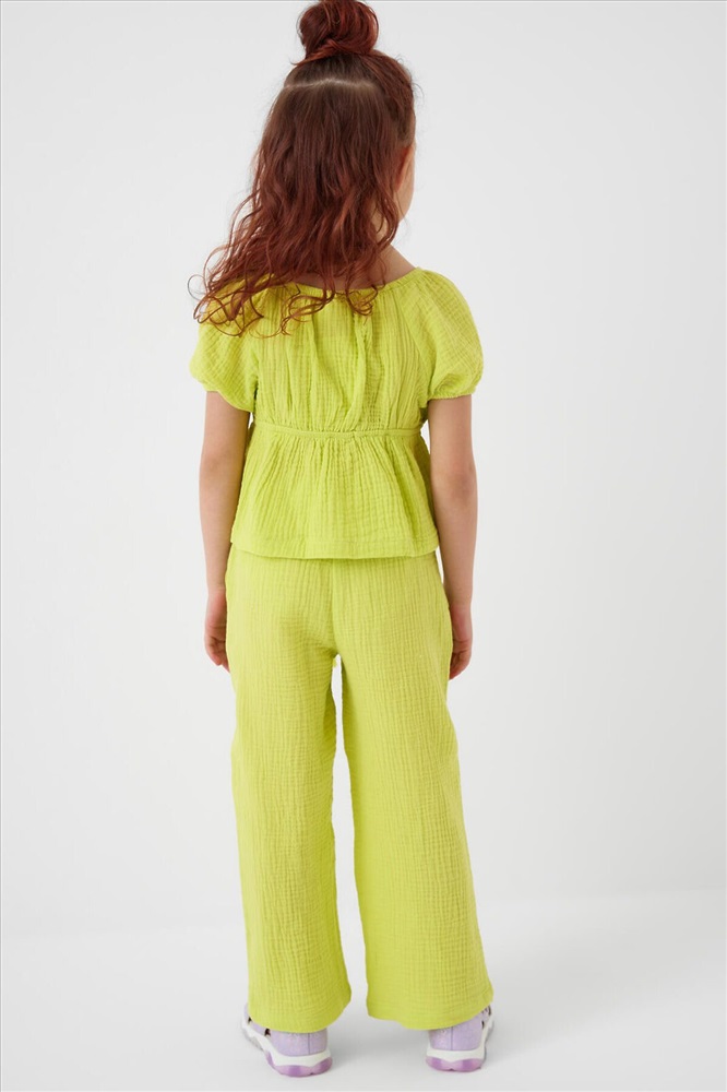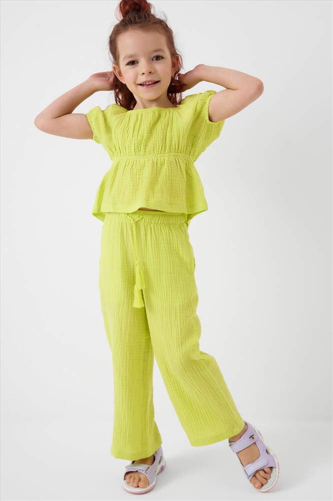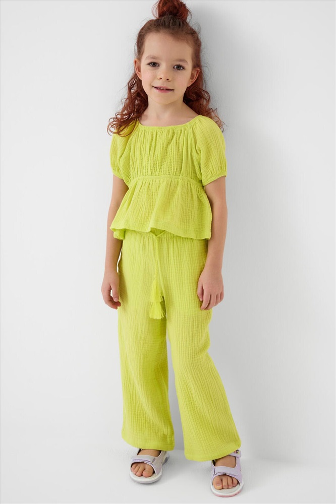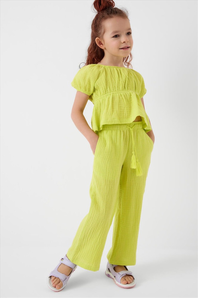 Легкий летний детский комплект для девочки. Состоит из укороченной блузки и широких брюк. Материал – мягкий хлопковый муслин, дышащий и приятный к телу. Блузка с пышными короткими рукавами и сборкой на резинке по талии, что создает аккуратную и женственную форму. Брюки – длинные и свободные, с высокой посадкой и резинкой на поясе. По бокам — удобные карманы.