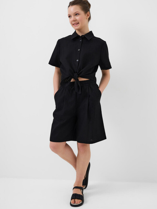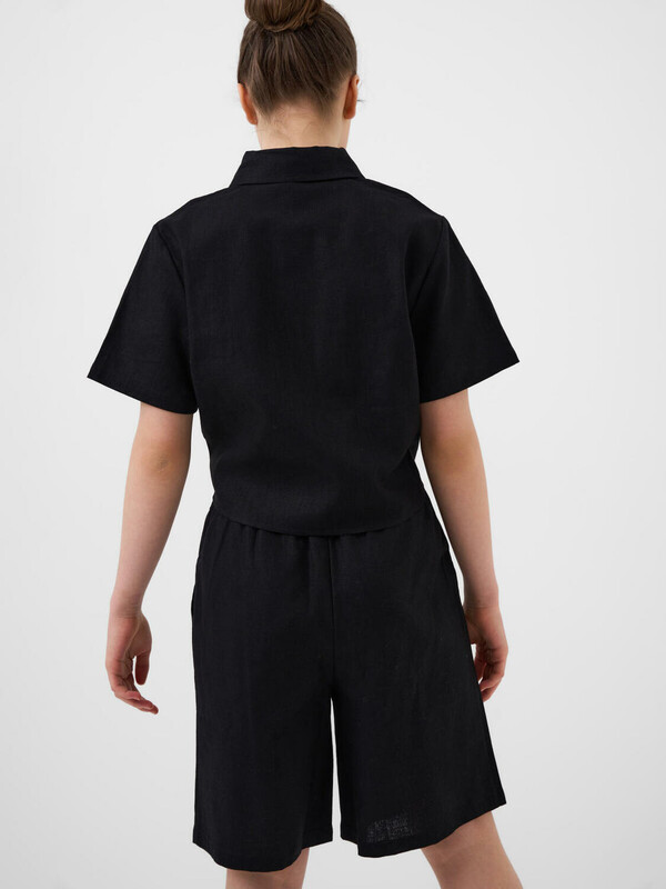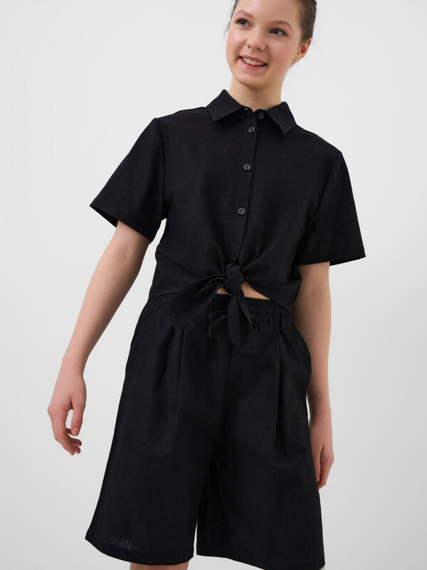 Легкий льняной костюм для девочки подростка. Рубашка прямого кроя с коротким рукавом и застежкой на пуговицы. Классический воротник, укороченная длина с завязками на талии. Свободные шорты на резинке со шнурком для регулировки. Удобные боковые карманы.