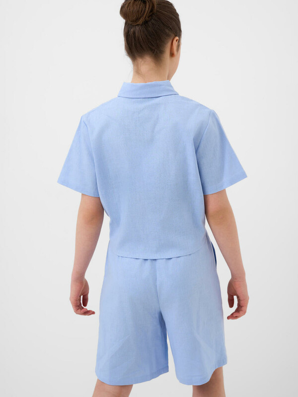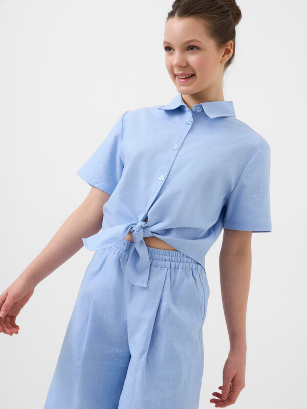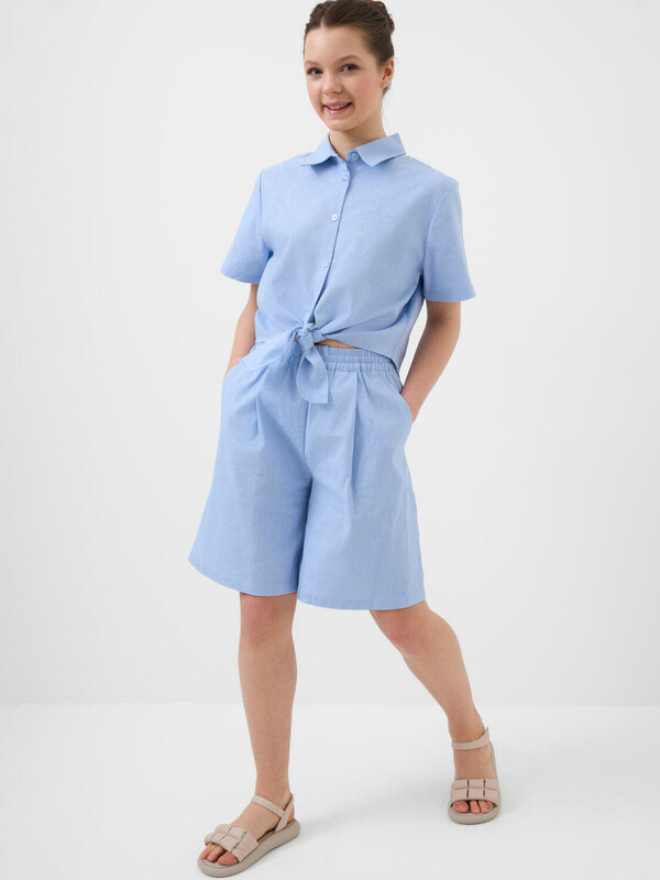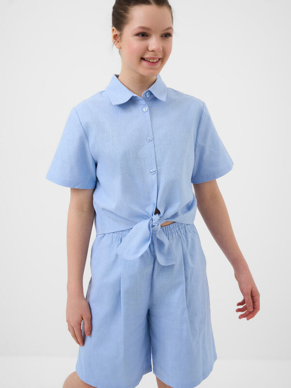 Производитель: PlayToday Легкий льняной костюм для девочки подростка. Рубашка прямого кроя с коротким рукавом и застежкой на пуговицы. Классический воротник, укороченная длина с завязками на талии. Свободные шорты на резинке со шнурком для регулировки. Удобные боковые карманы.