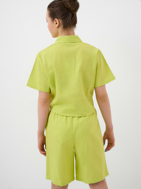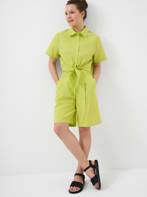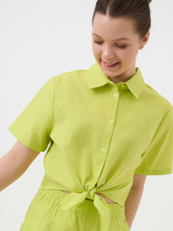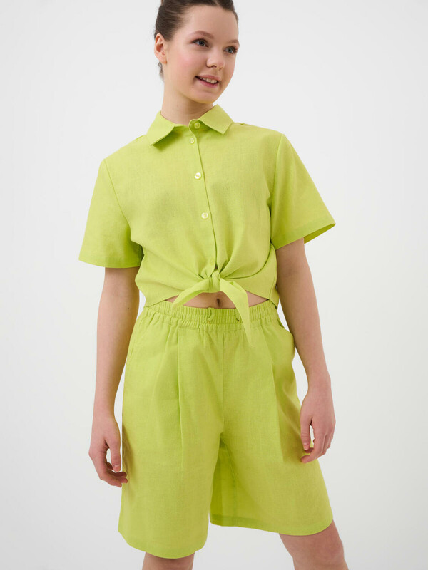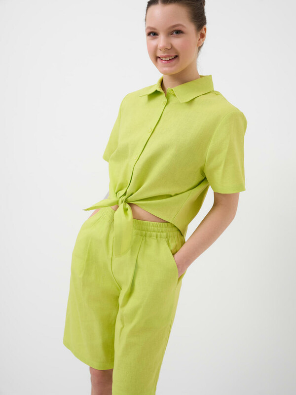 Производитель: PlayToday Легкий льняной костюм для девочки подростка. Рубашка прямого кроя с коротким рукавом и застежкой на пуговицы. Классический воротник, укороченная длина с завязками на талии. Свободные шорты на резинке со шнурком для регулировки. Удобные боковые карманы.