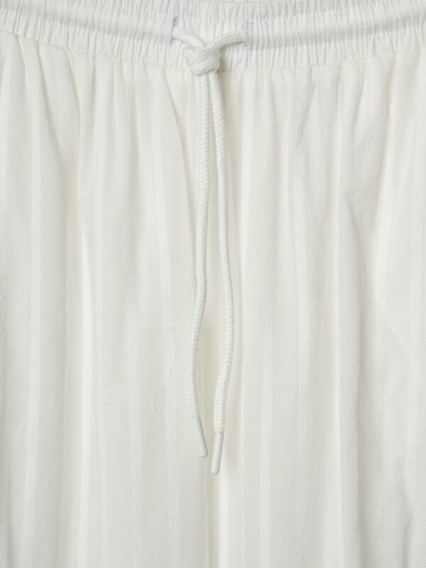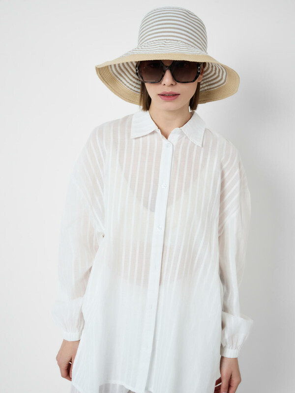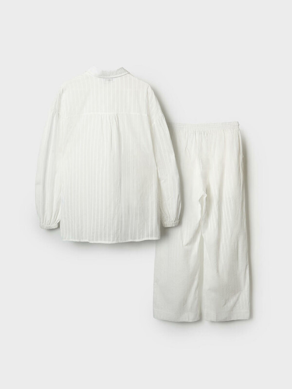 Легкий женский хлопковый костюм. Рубашка свободного прямого кроя с застежкой на пуговицы. Классический воротник и разрезы по бокам. Манжеты на резинке. Широкие брюки палаццо на резинке со шнурком для регулировки. Удобные боковые карманы.