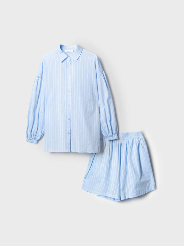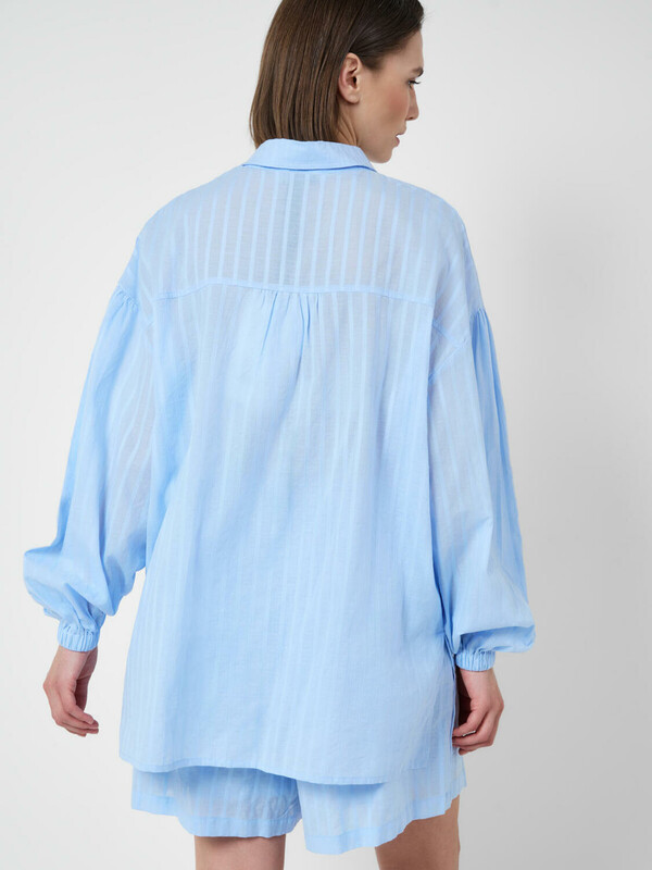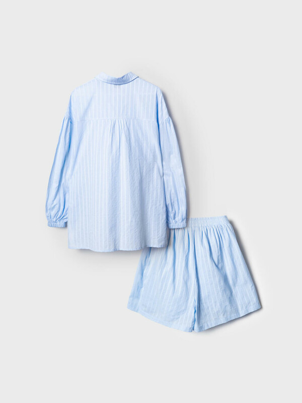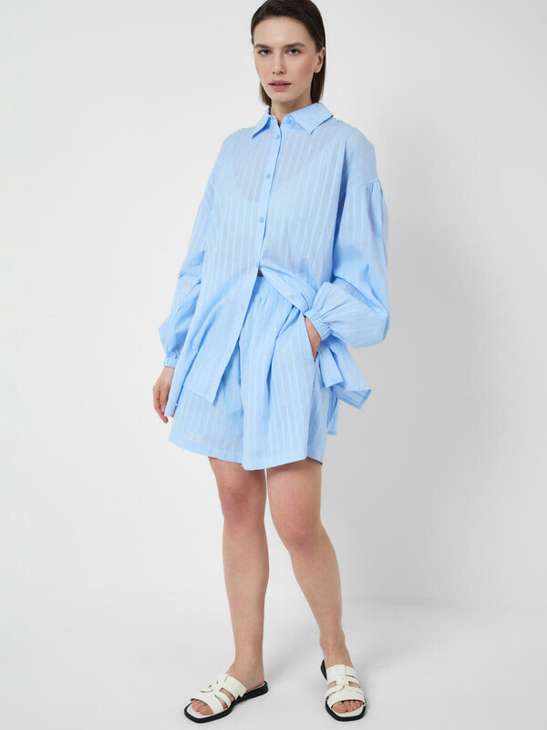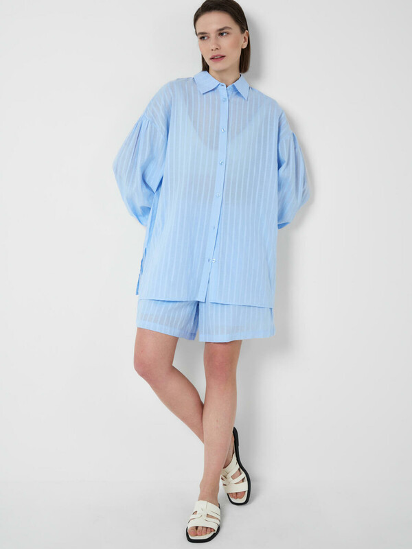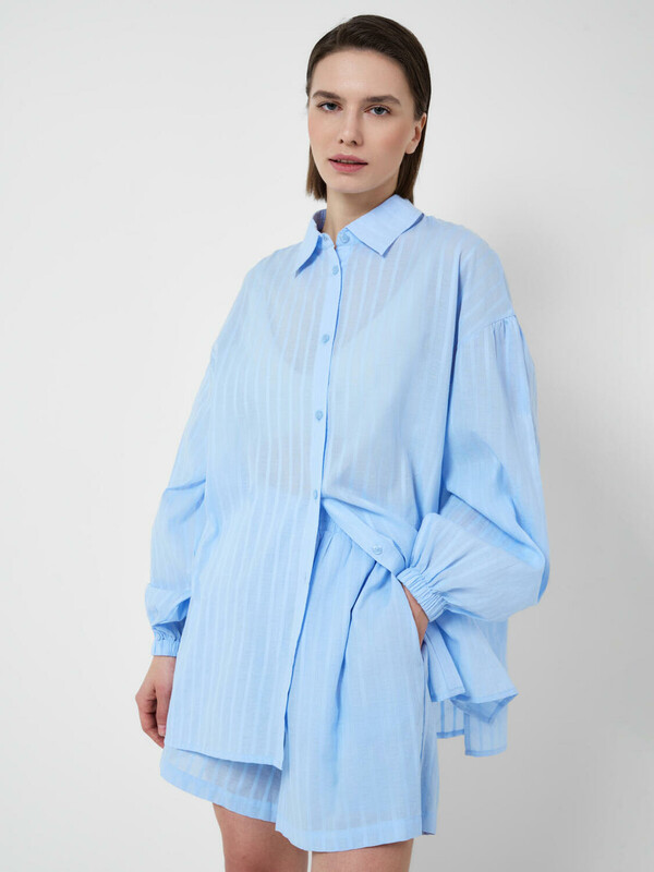Легкий женский хлопковый костюм. Рубашка оверсайз с длинным рукавом и застежкой на пуговицы. Классический воротник, боковые разрезы. Манжеты на резинке. Свободные шорты на резинке.