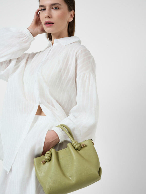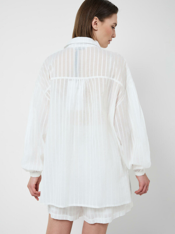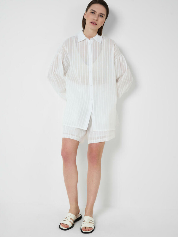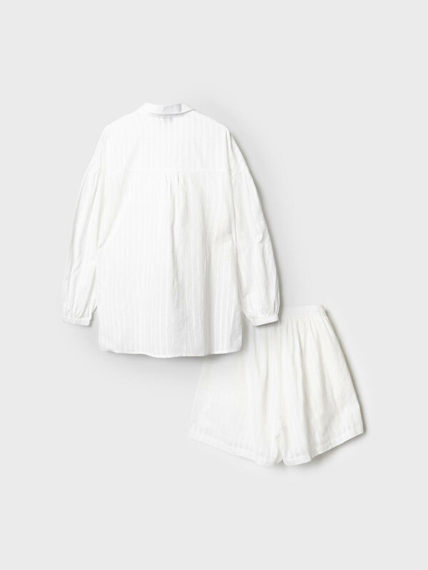 Легкий женский хлопковый костюм. Рубашка оверсайз с длинным рукавом и застежкой на пуговицы. Классический воротник, боковые разрезы. Манжеты на резинке. Свободные шорты на резинке.