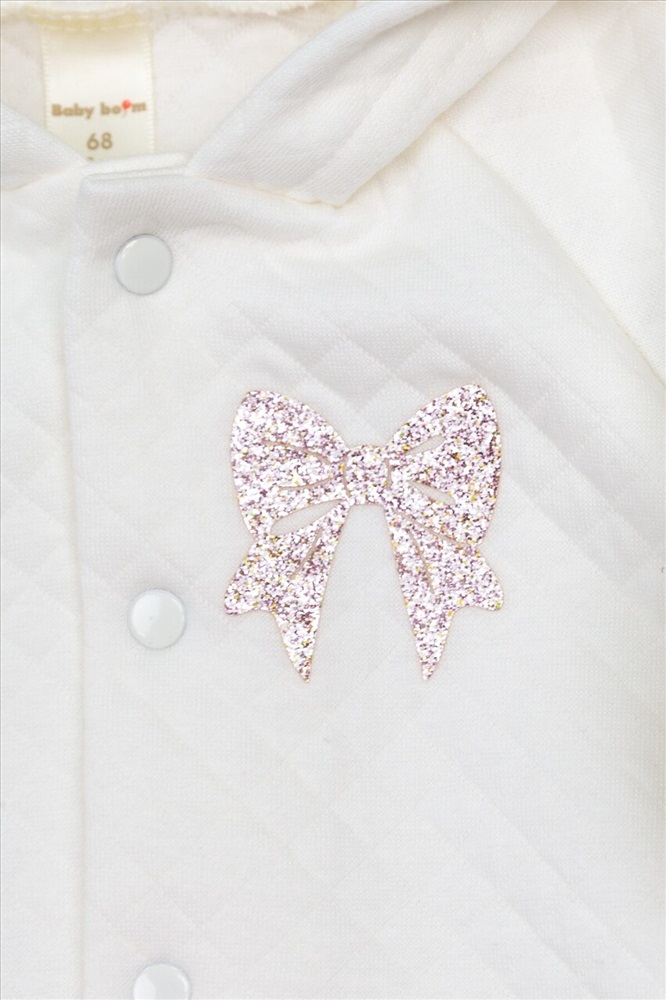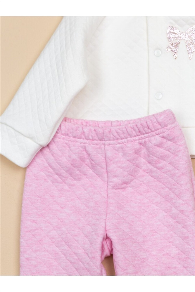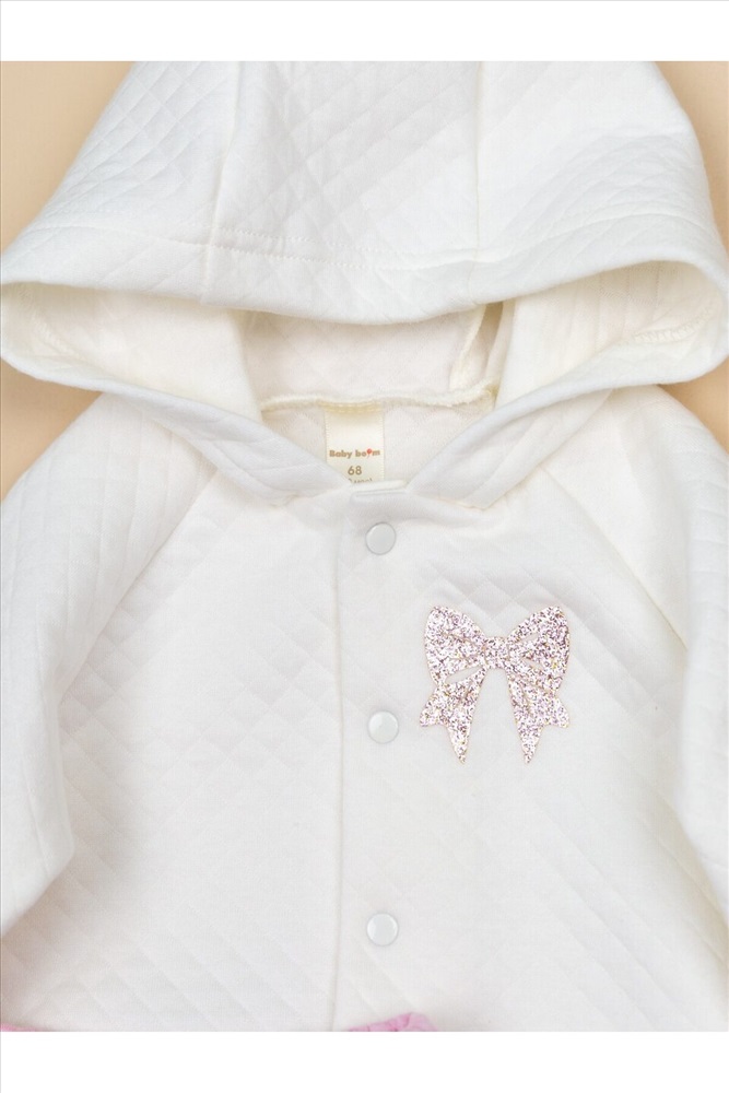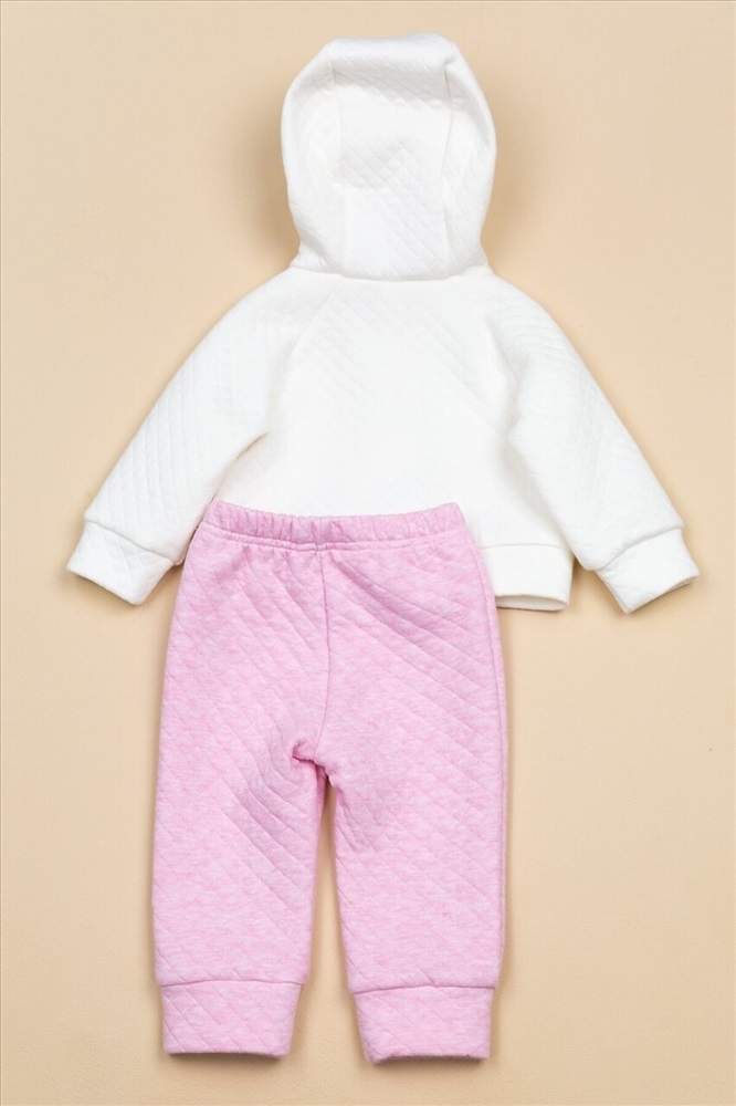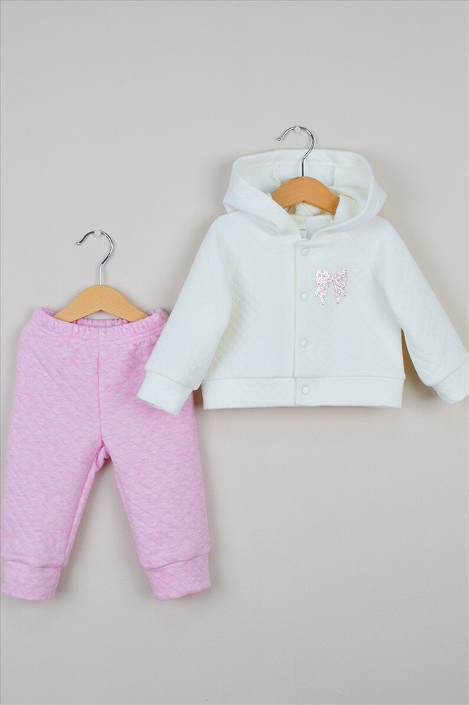 Теплый комплект из кофточки с капюшоном на кнопках и брючек. На левой детали переда кофточки аппликация. Выполнен из однотонного капитона (100% хлопок).