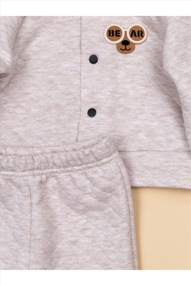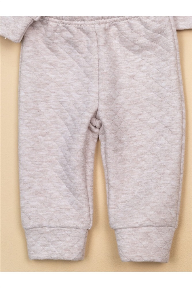Теплый комплект из кофточки с капюшоном на кнопках и брючек. На левой детали переда кофточки аппликация. Выполнен из однотонного капитона (100% хлопок).