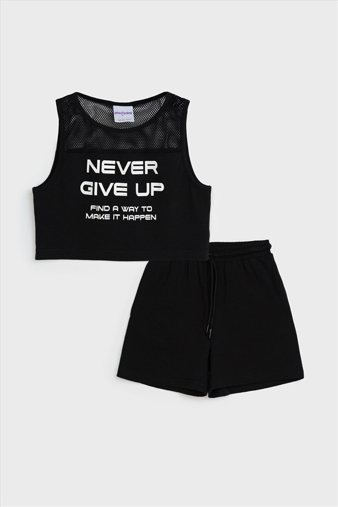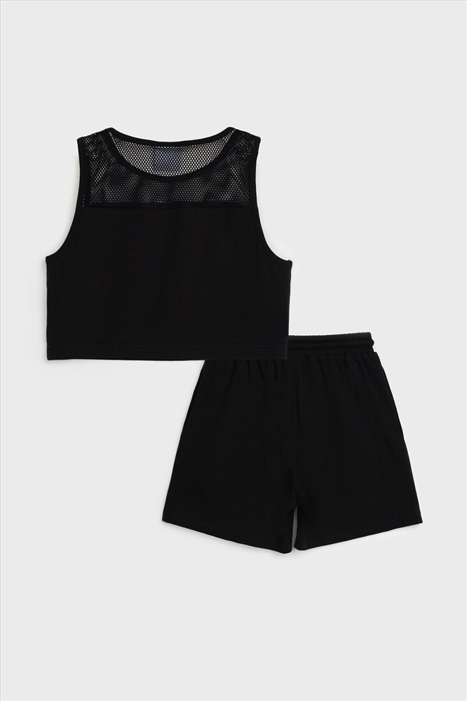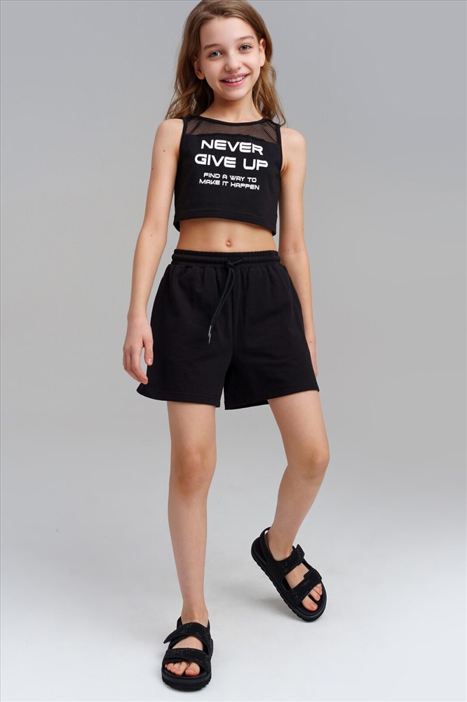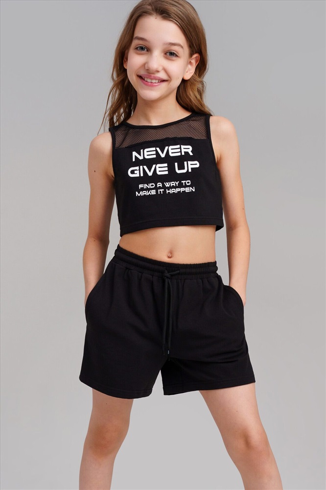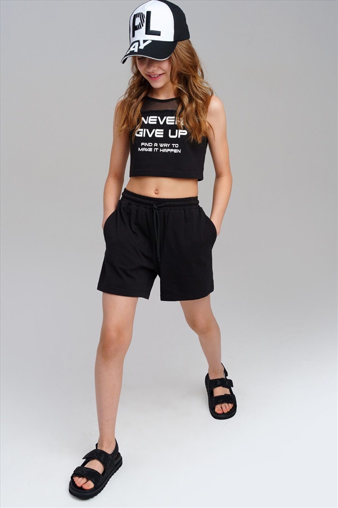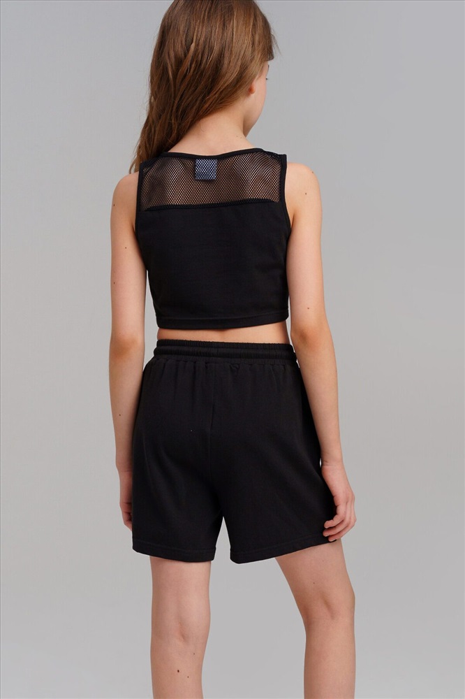 Костюм для девочки подростка. Футболка, шорты из эластичного и приятного на ощупь трикотажа джерси. Шорты на резинке со шнурком. Функциональные боковые карманы. Высокое содержание хлопка. Декор из сетки. Модель выполнена из качественного и приятного на ощупь трикотажа.